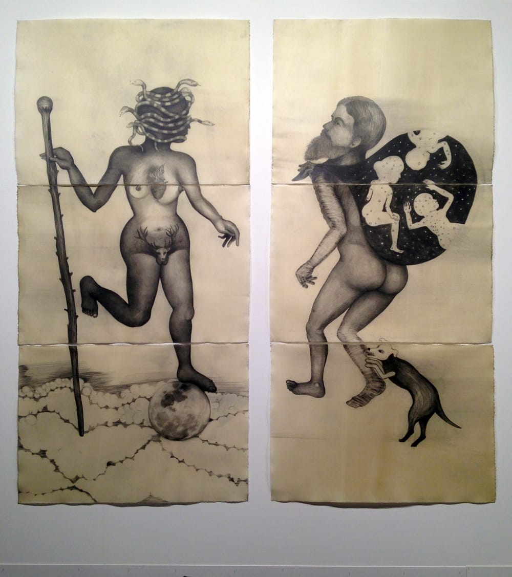 Among them, the most inexplicable and unfamiliar pieces stood out: an oil painting in white and golden yellow, “Dog and Snake” (2004-05) by Susan Rothenberg; a set of revelatory pre-Pop, quasi-Cubist compositions by Dorothy Iannone from the early 1960s; and a pair of symbol-laden graphite drawings of mythical female and male figures by Sandra Vásquez de la Horra (“Deidad Planetaria” and “El Portador de las Estrellas,” both 2015), each made up of three vertically-stacked sheets of paper, unframed and pinned to the wall.