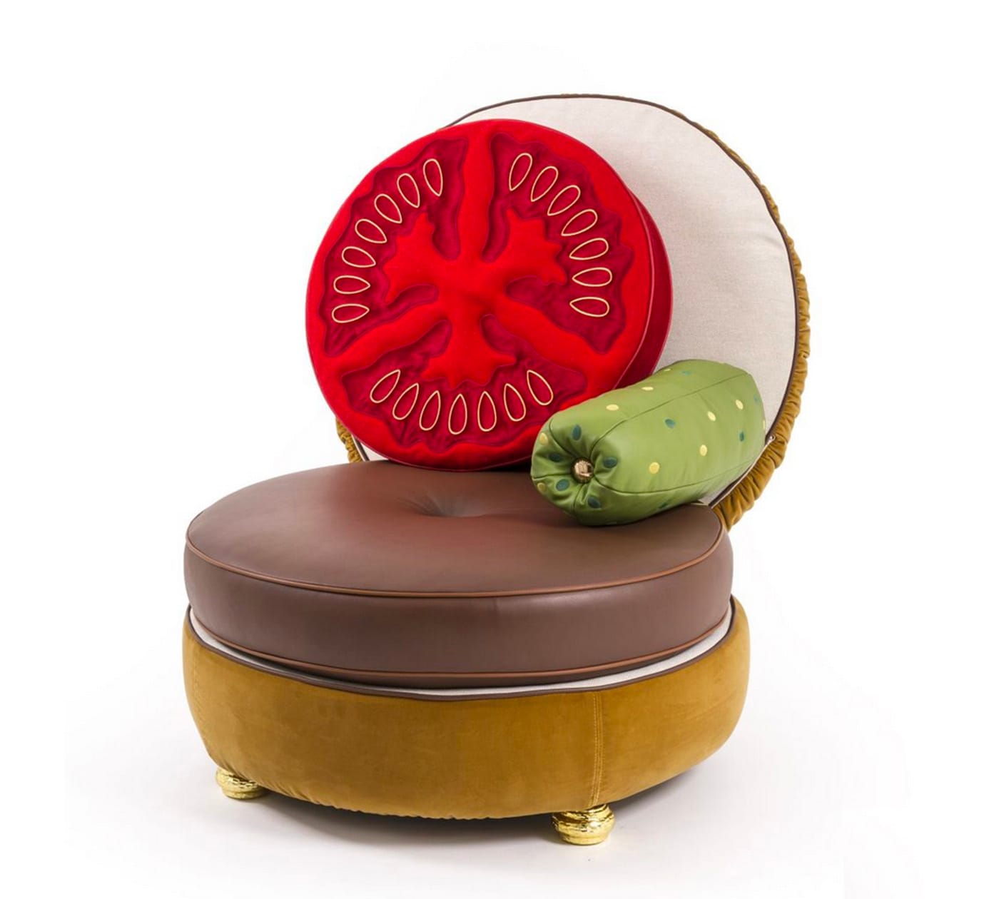 From Seletti, Italian retailer of luxury designer home goods, comes the “Burger Chair” — a fully functional and sittable soft sculpture for those with a discerning eye for delicious décor. As Oldenburg himself knew all too well, no one likes a plain burger, so you’ll want to accessorize with gherkin, cucumber, or tomato cushions (sold separately) to complete the homage. Cucumber on burgers, as American as late-stage capitalism!