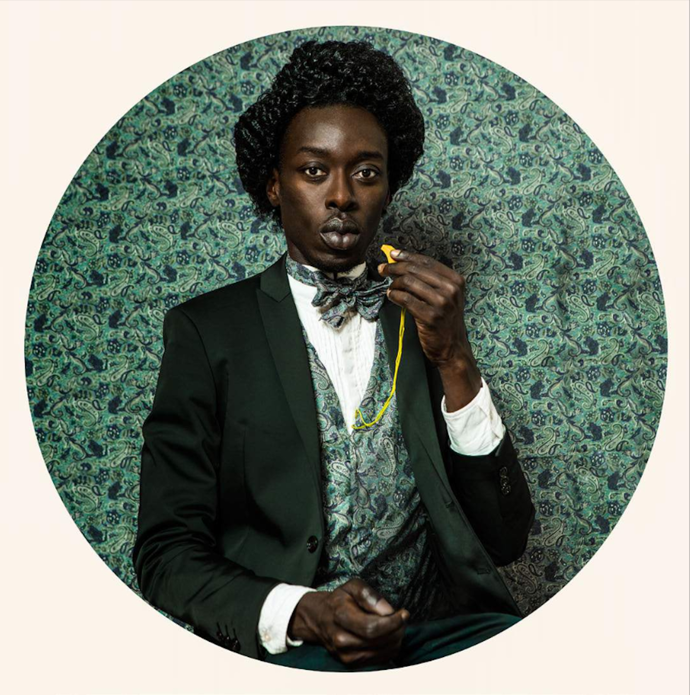 For instance, “St Benedict of Palermo” (2014) is based on a sculpture of the anointed Moorish friar attributed to Jose Montes de Oca of Italy. In his self-image, Diop stands in a regal coppery-gold gown with his hands extended out to his congregation. His image consecrates the benedict, who was born to African slaves before his eventual beatification by Pope Benedict XIV in 1743 and canonization in 1807 by Pope Pius VII. Similarly, Diop’s “Olaudah Equiano” (2014), dressed in a fashionable British 18th-century cravat and jacket, depicts the distinguished freed slave who documented his advocacy for the abolition of slavery in London in his 1789 autobiography.