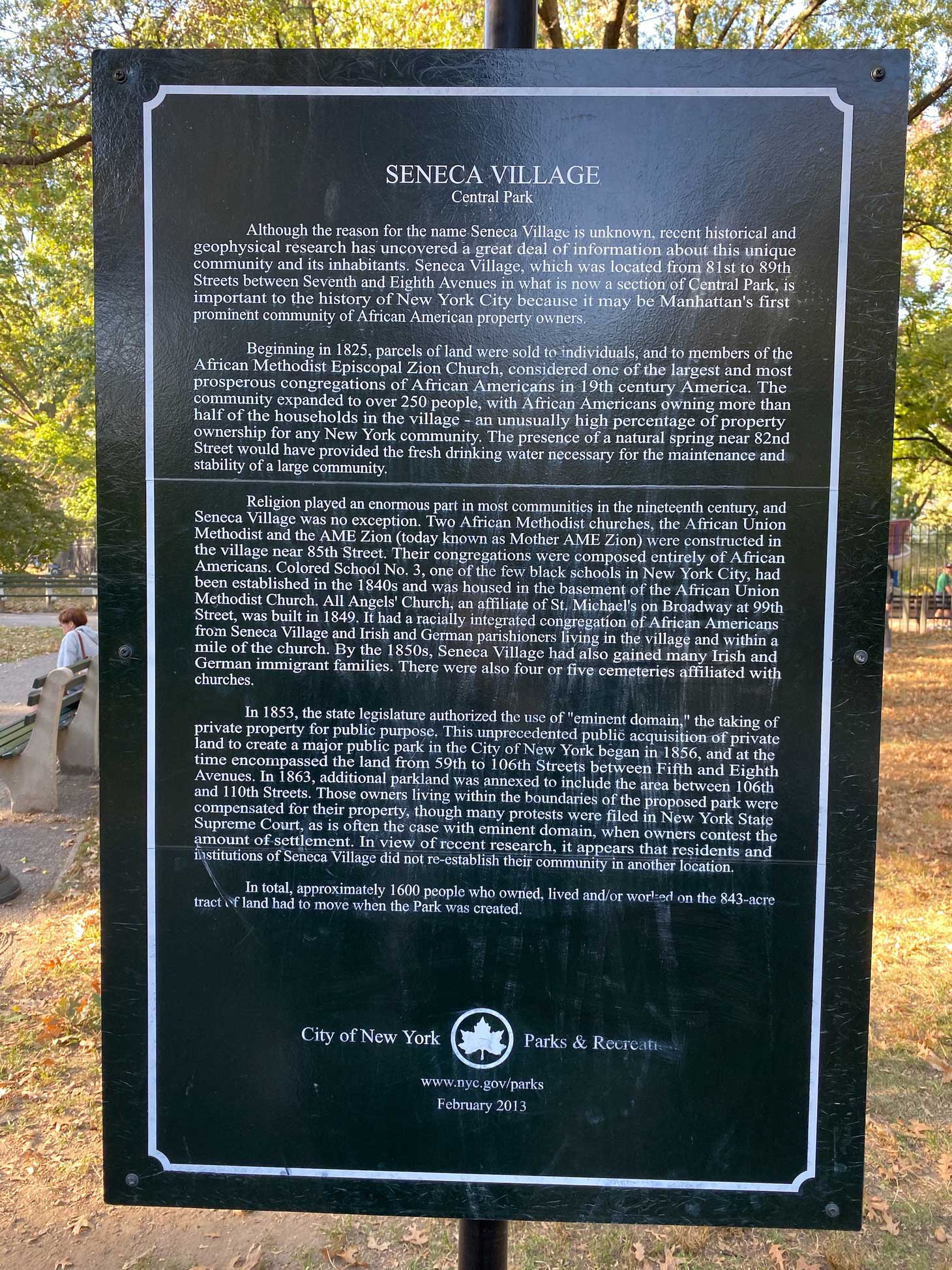 Seneca Village — the stretch of land between West 83rd and 89th streets in Central Park — is infamous, yet underrecognized. The site, once home to nearly 300 residents, is a striking example of property that was unjustly snatched from Black Americans in the 1850s to build one of Manhattan’s Crown Jewels. (Of its 300 residents, two-thirds were Black.)