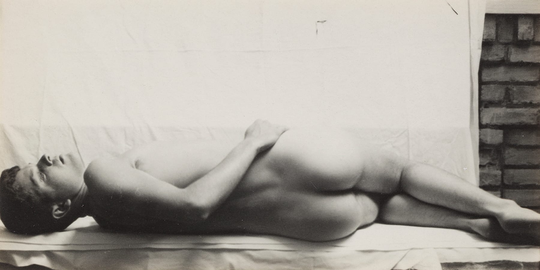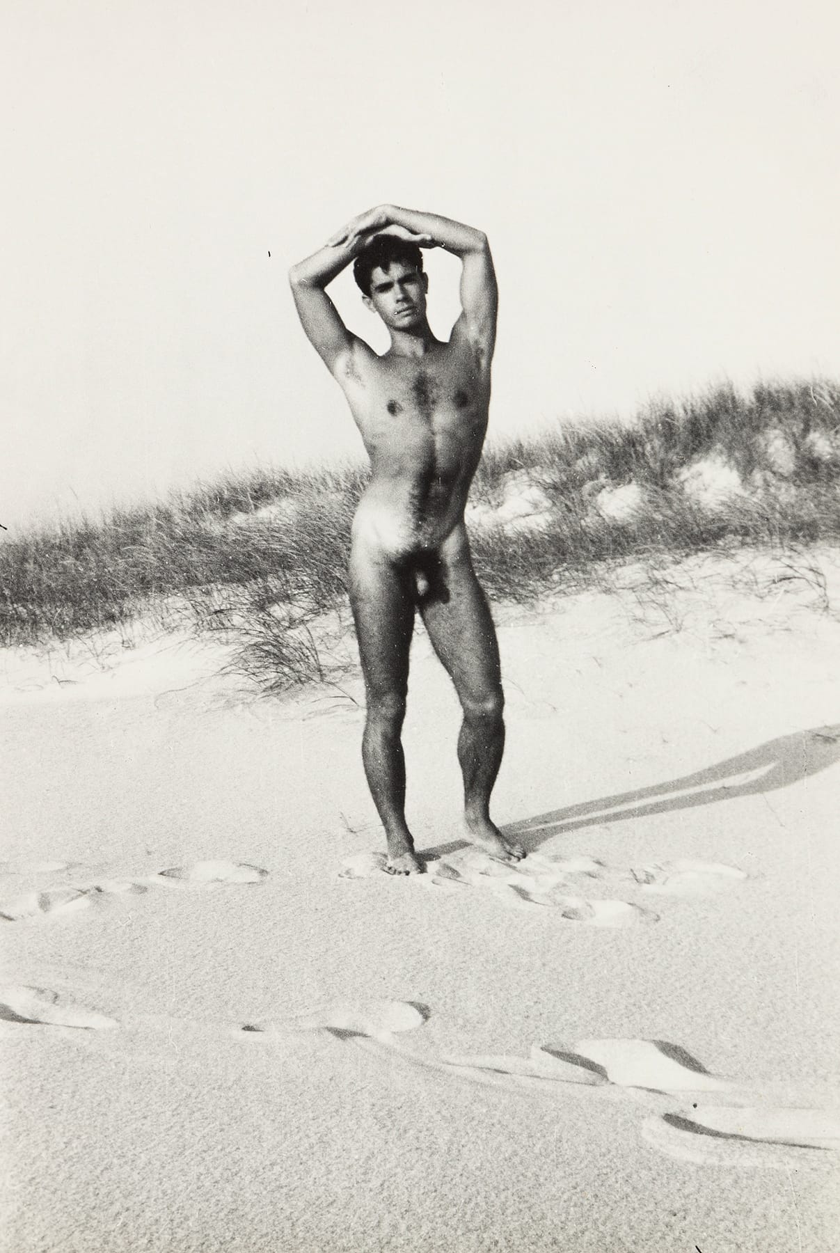 Cadmus, French, and Hoening were enmeshed with one another romantically as well as creatively. After Cadmus and French met at the Art Students League in 1926, the two became long-term lovers. When French married Hoening, who was also an artist, in 1937, an erotic-familial-artistic triad was formed. In New York studios, or more often, while vacationing on the beaches of Fire Island, Provincetown, and Nantucket, the trio began to avail itself of Hoening’s Leica, making a number of silver gelatin prints. They staged erotically charged photographs of themselves and those in their artistic circles, many of whom were gay: close friends included writer Christopher Isherwood, painter George Tooker, and fashion photographer George Platt Lynes (who was in a ménage à trois of his own with Glenway Wescott and Monroe Wheeler). In centering bodies, the photographs of course reflected the more homogeneous aspects of the trio's friend group, which was largely young, white, cisgender, and male.
