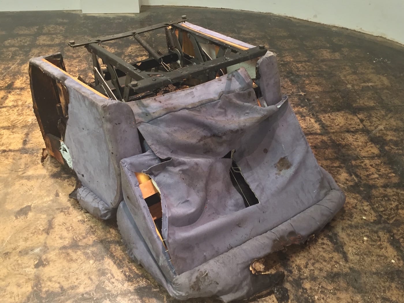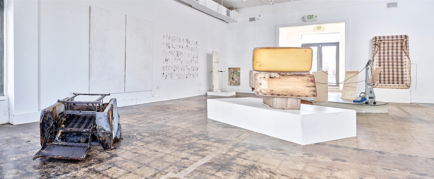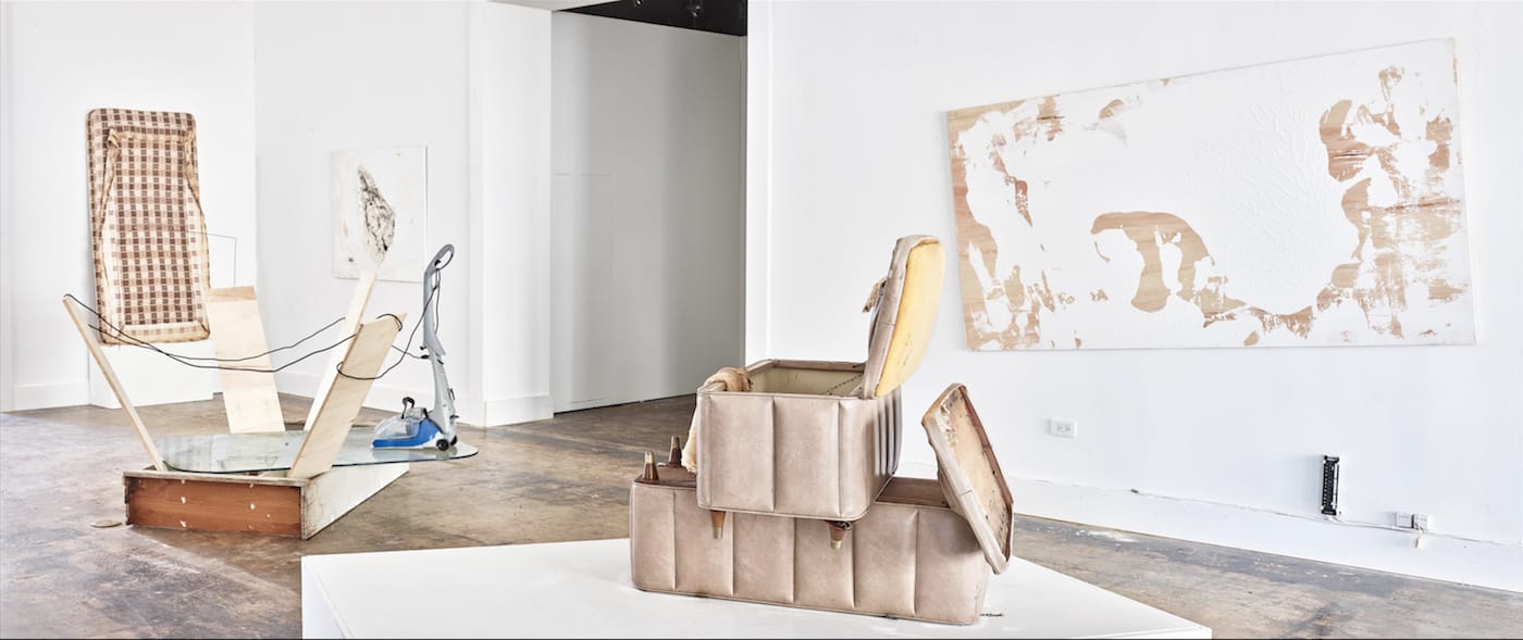 At Dust Patterns, familiar household items—vacuum cleaners, glass tabletops, a mattress—are overturned and under-stuffed, placed on their sides or backs or jammed with wooden planks that fan out like fingertips. They’re taken from a foreclosed house a few miles south of the gallery, remnants of a life that Serpas was never privy to, but that she has transformed into almost bodily configurations: a crowd of plush, rotting people. (Florida is filled with empty homes. In 2016, the state’s foreclosure rate was the highest in the nation, at 1.95%.) The footrest of a La-Z-boy sprawls like a tongue; two shell-colored ottomans, one atop the other, recall roughhousing children.
