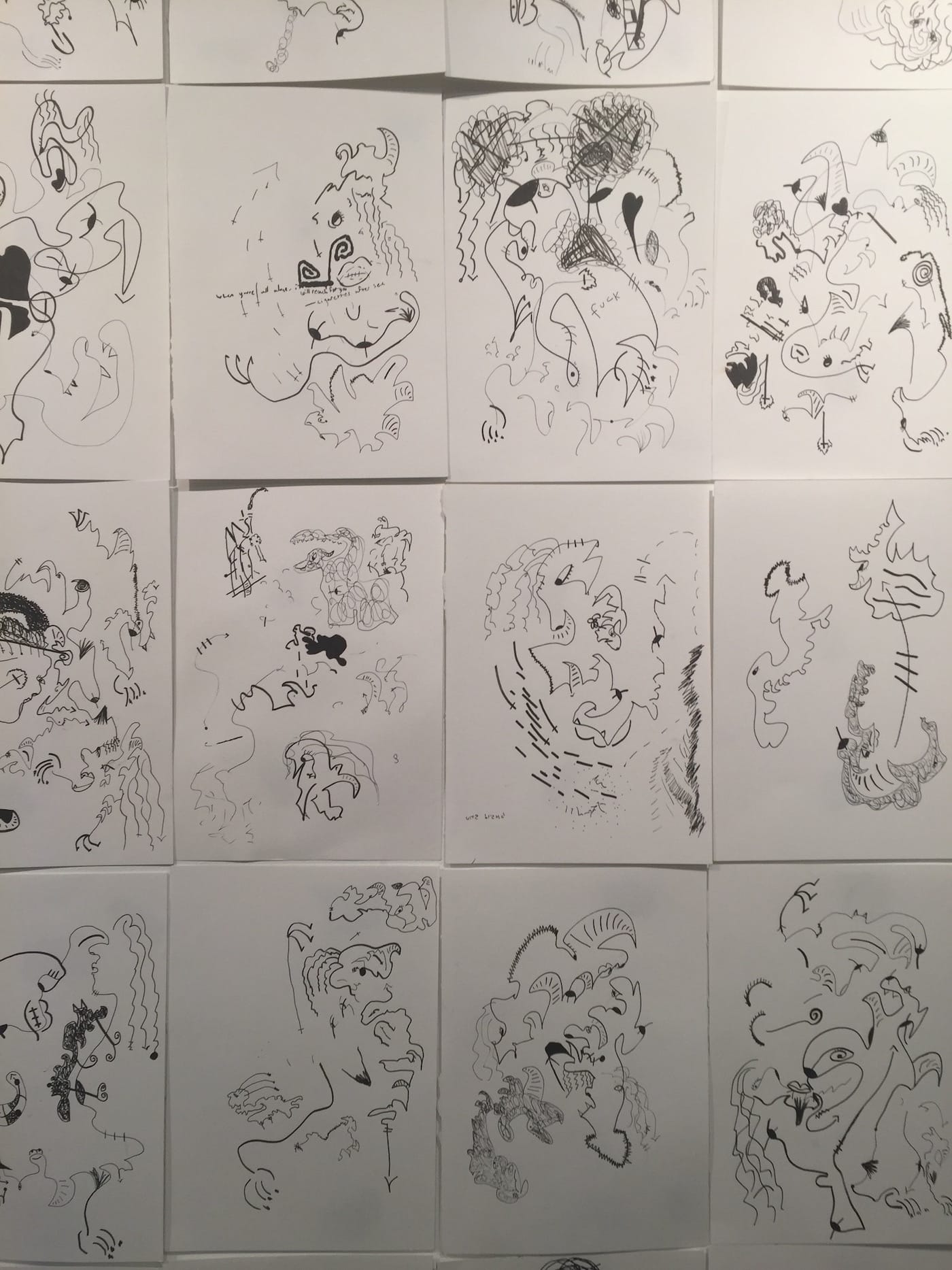 One wall is covered with small drawings of figures that curve and swoop with no apparent logic; Serpas made them while recovering from gender-affirming surgery, shortly before flying to Miami. (The surgery was crowdfunded, and the drawings are her gifts to the donors, scheduled to be mailed at exhibition’s end.) “I draw trans bodies,” she told me, “and when I convert them into their environments, I’m also usually trying to highlight the dangers of that experience … how you feel you’re being perceived, how you’re actually being perceived, how you’re engaged.”