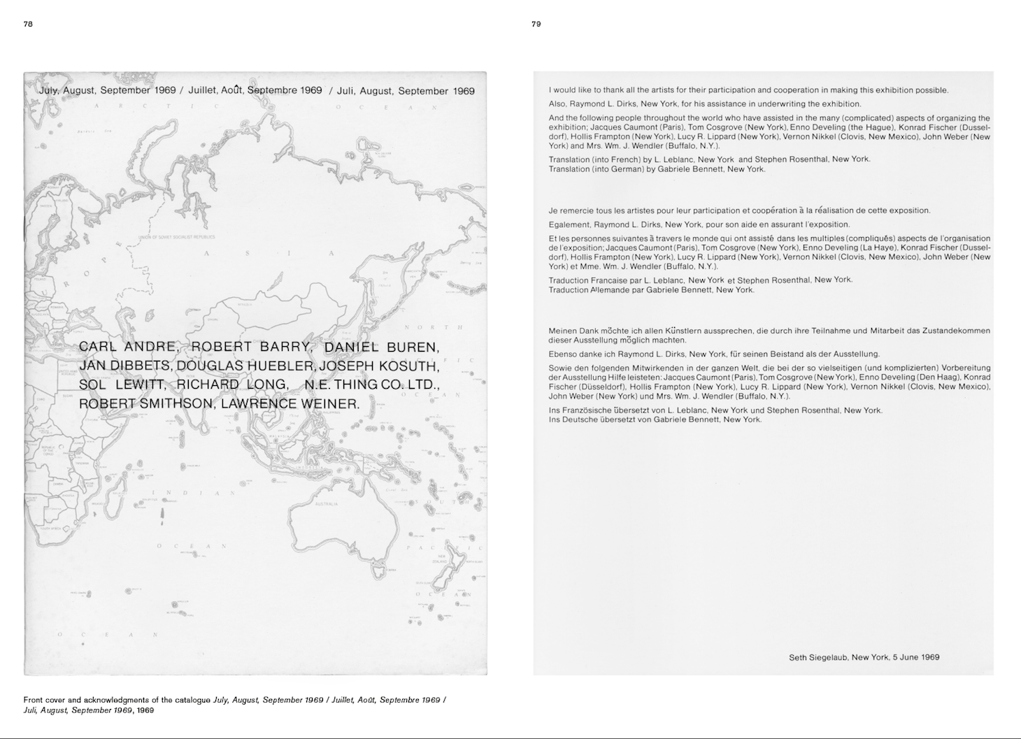 "Better Read Than Dead" Writings and Interviews 1964-2013, recently published by Walther König, serves this purpose. It includes selections of Siegelaub’s acknowledgements, prefaces and introductions, project outlines, letters and mailings, instructions, invitations, and transcripts of interviews and talks. For someone who resisted the label of “writer,” it is especially surprising to find that over 300 pages of such papers exist and read easily as both reference compendium and narrative book.