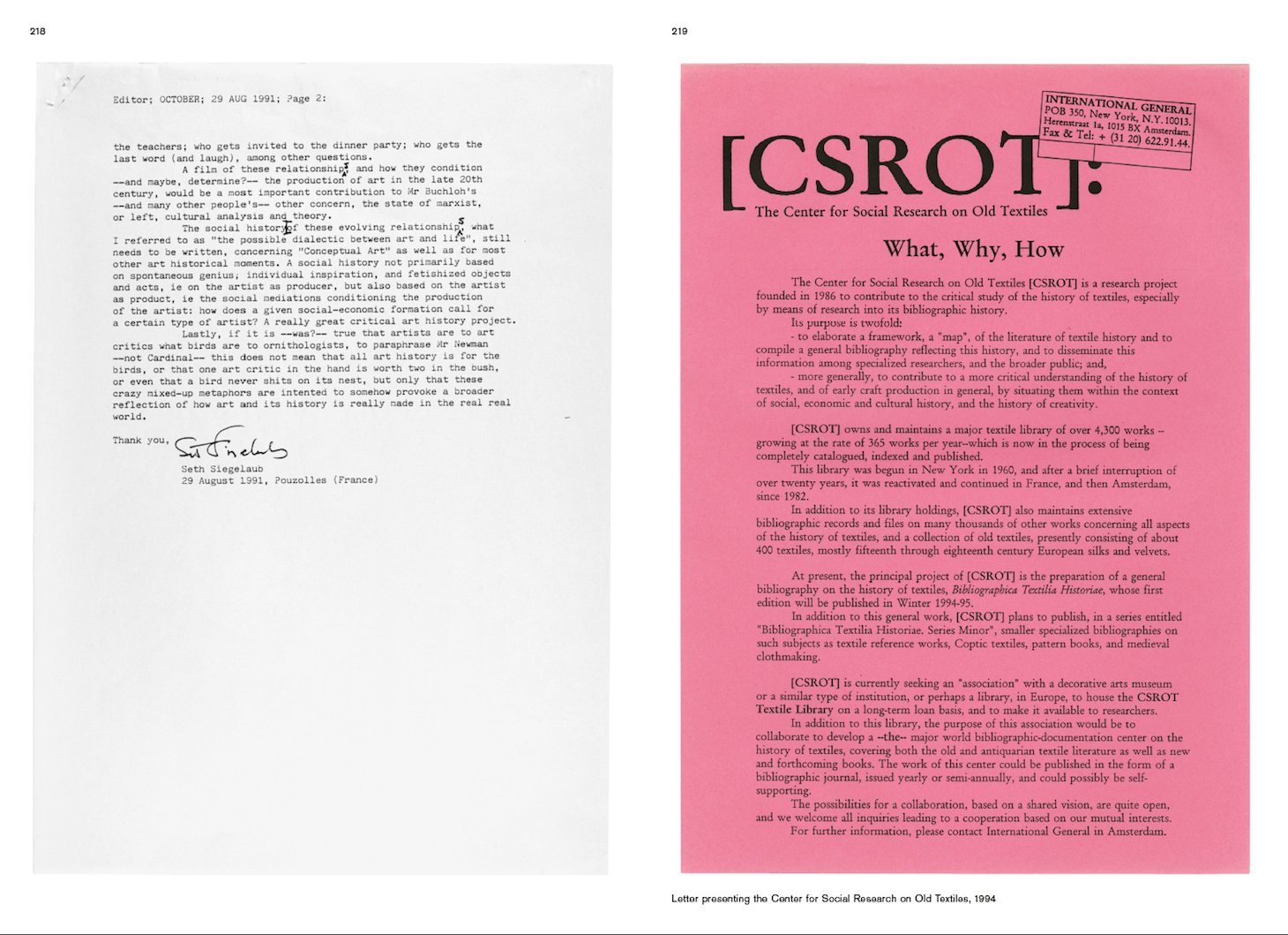 In 1997, IG published Bibliographica Textilia Historiae, in which Siegelaub states,