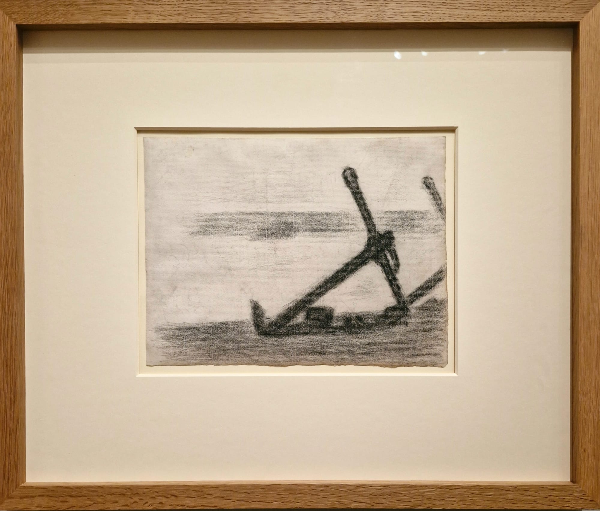 The exhibition really succeeds with its preparatory versions of the larger completed paintings. Compare, for example, “Le Bec du Hoc (Grandcamp)” from the Tate and its miniature study version from the National Gallery of Australia, Canberra (both 1885). In the study, the singular beak-like rock formation is rendered in larger “points” of relatively consistent distribution and direction, with slightly elongated horizontal dashes defining the sea area. For the final version, the angular dash direction is dialed up a notch, and the diagonal hatching is more distinct, resulting in a chaotic atmosphere. Similarly, the presence of a preparatory study for “The Channel of Gravelines: An Evening” (1890) from the Victoria & Albert Museum is fascinatingly alarming because it is the visual and formal antithesis of its finished version at the Museum of Modern Art in New York; in the study, smooth Conte crayon outlines silhouetted anchors against a flatly delineated beach.