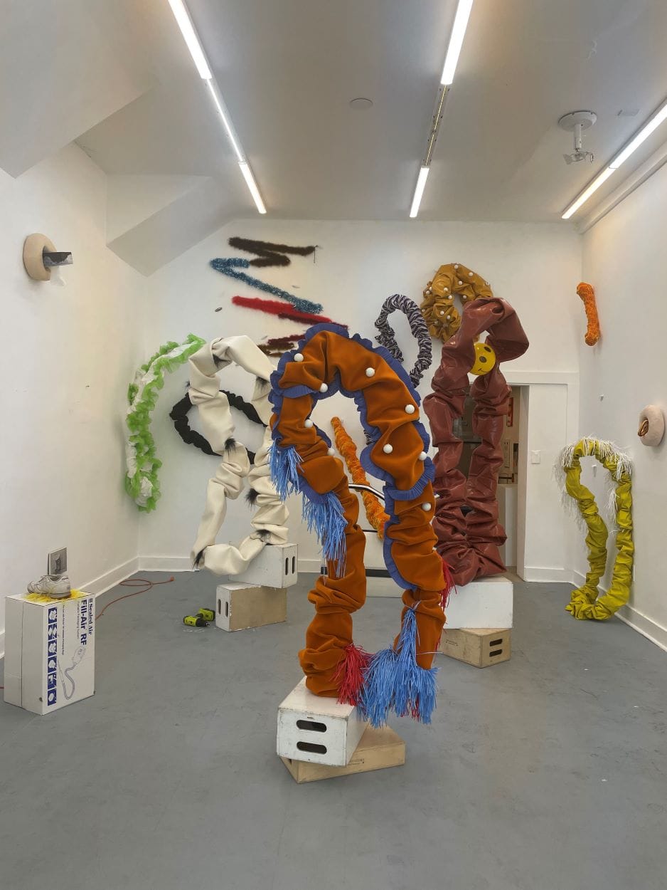 The gallery’s current show — Powell’s seventh to curate at Lauren Powell Projects since it opened in 2021 — is a first for set designer Andy Harman. And it’s the first white-walled installation in the space: A cheeky re-staging of Harman’s Brooklyn studio offers even the same square footage for oversized scrunchie sculptures to loiter near intentional holes in the wall. “I like to say yes to the things people say no to,” Powell laughs.