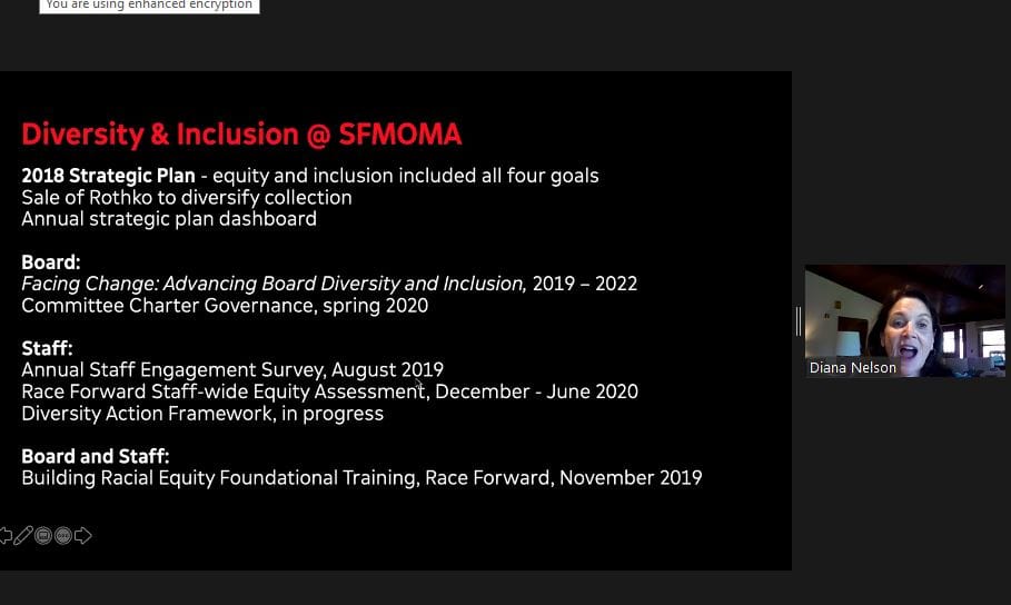 During the meeting, SFMOMA Vice Chair Diana Nelson presented the museum’s strategic plan for diversity and inclusion, a modification of its plan from 2018.