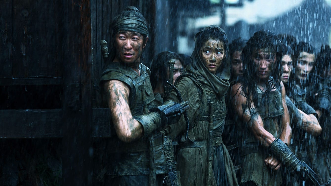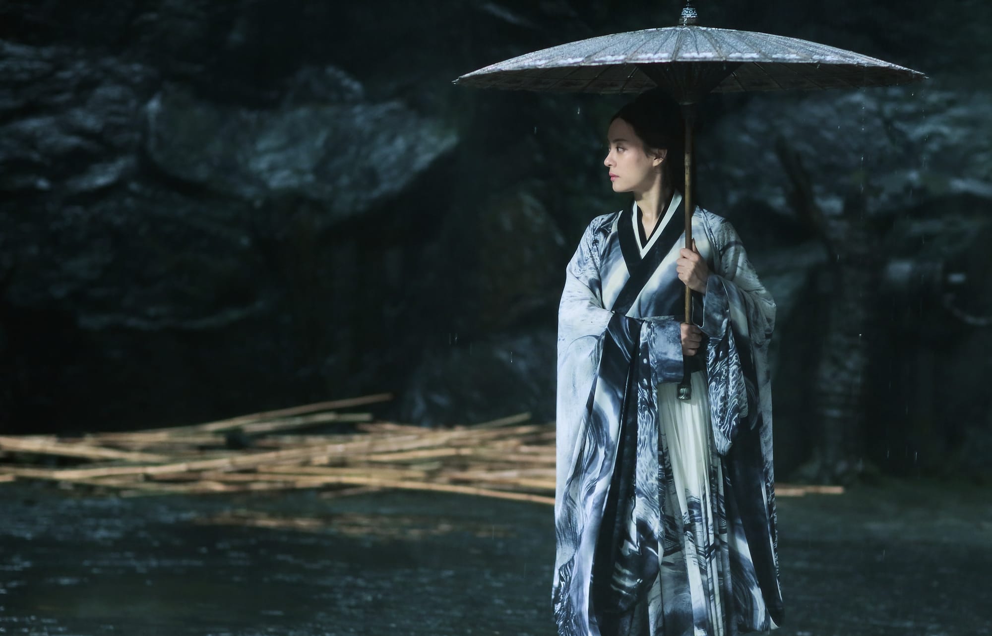 The movie’s black, white, and gray palette is thus not just a distinctive aesthetic, but also a reflection of the themes. The taijitu (the yin/yang symbol) is a prominent motif, not only inscribed on the floor that Yu and King practice fighting upon, but also suggested in details such as the film’s most ubiquitous weapon: an umbrella made of razors. The movie makes a deliberate contrast between the brightly lit court and the dark recesses of the caves where Jing, Yu, and Ai hold counsel, as well as the shadowy, grimy battlefields.