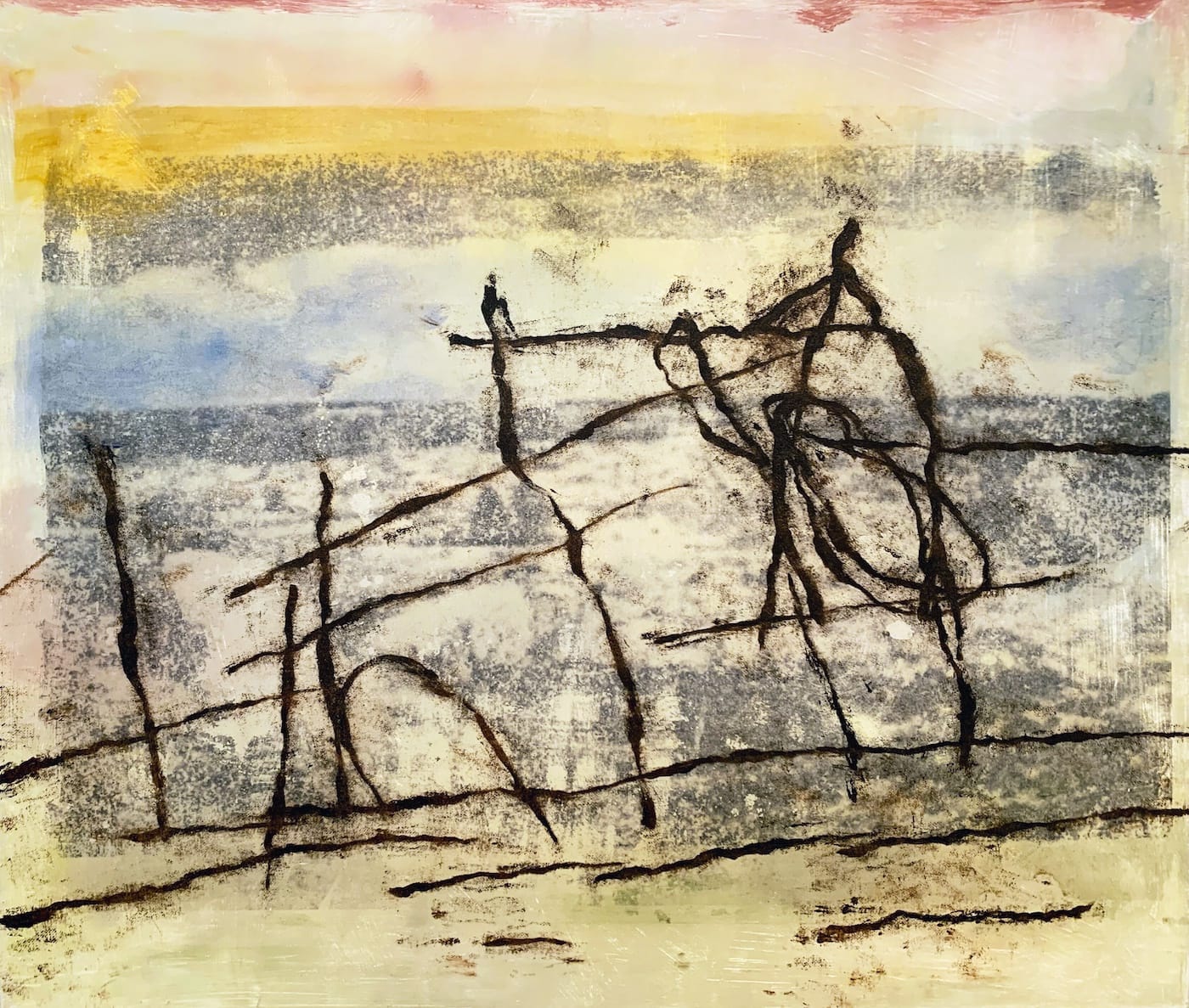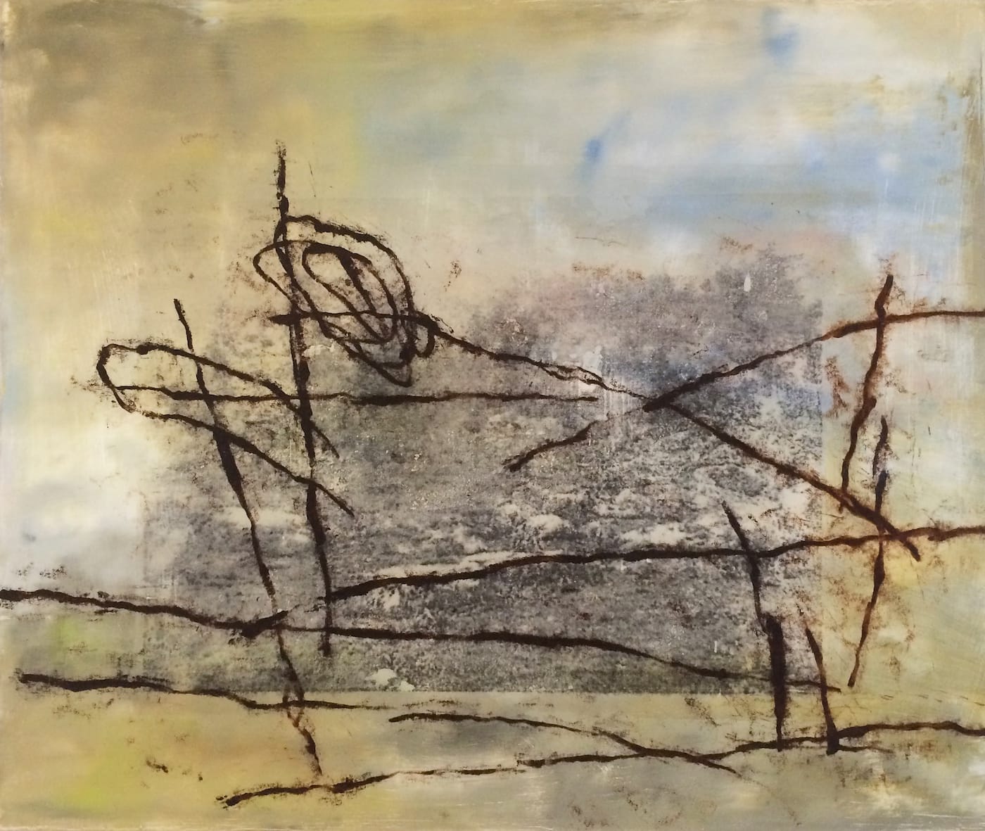 Kit White uses photo transfers of Civil War-era photographs as an initial ground, and then paints a lyrical form of abstraction on top. There is usually a hint of a landscape in his abstractions. Works like “Open Field,” (2019) feel melancholic, but with just the right amount of levity — a dense atmosphere of pale blues, yellows and grays, on top of which White paints sinewy black lines that contort, knot and, intersect.