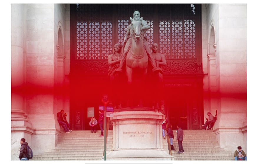 Nona Faustine is not a documentary photographer, but her work borrows from its familiar form of presentation. Her work, “Contested,” (2019), creates an aesthetic barrier between the viewer and the controversial monument of Theodore Roosevelt in front of the Museum of Natural History in New York. The monument, sculpted by James Earle Fraser in 1939, features Theodore Roosevelt on horseback, flanked on each side by stereotypical near-caricatures of Native American and African American men.