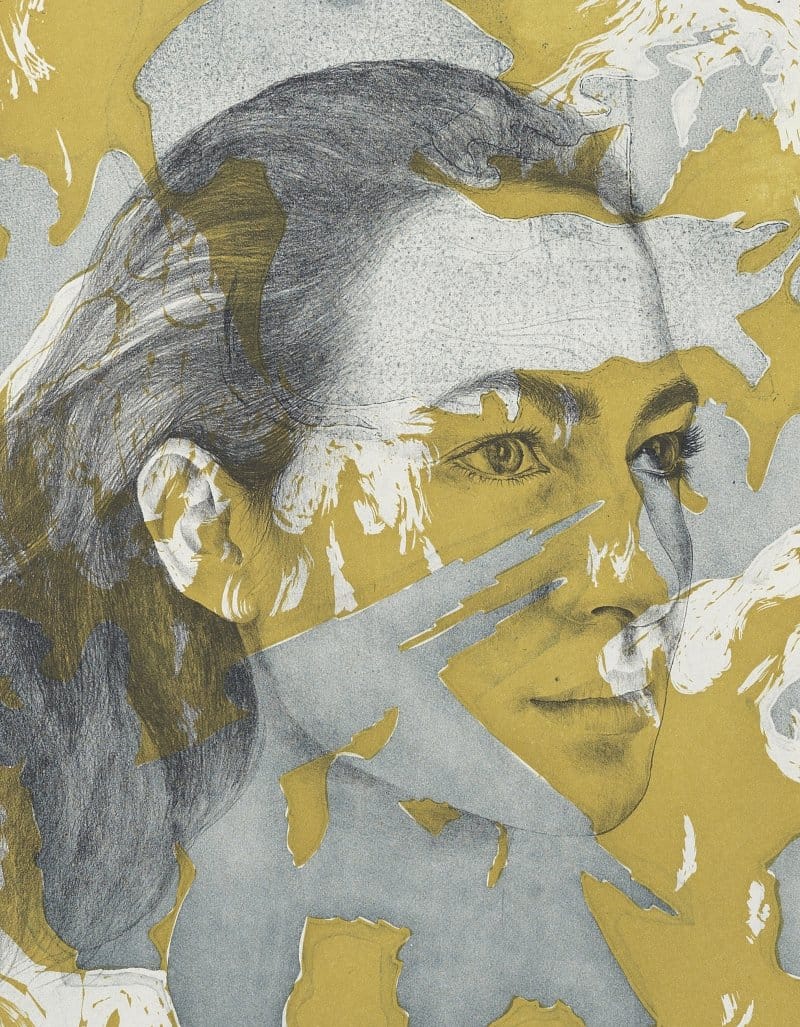 Sikander is barely visible in the subtlest of the portraits, her face camouflaged by the background. The silhouette of the Prophet is at the top right, while an angel hovers near the top of the picture plane. The Islamic scripture that narrates the night of the Ascension suggests that this angel is Gabriel, who accompanied the Prophet on his journey. The narration also mentions a destination where the shrub-bearing tree, called Sidra-tul-Munteha, thrives. This is where the Prophet travels forward alone, without Gabriel. In Sikander’s etching, the tree rests on the bottom zone of the pictorial space, its branches permeating her hidden face.