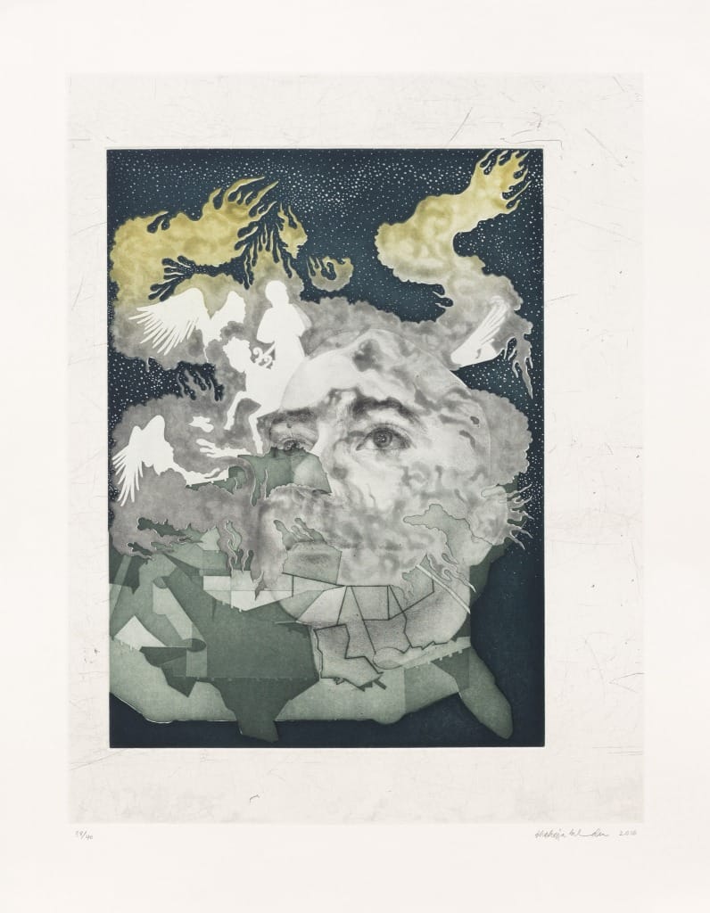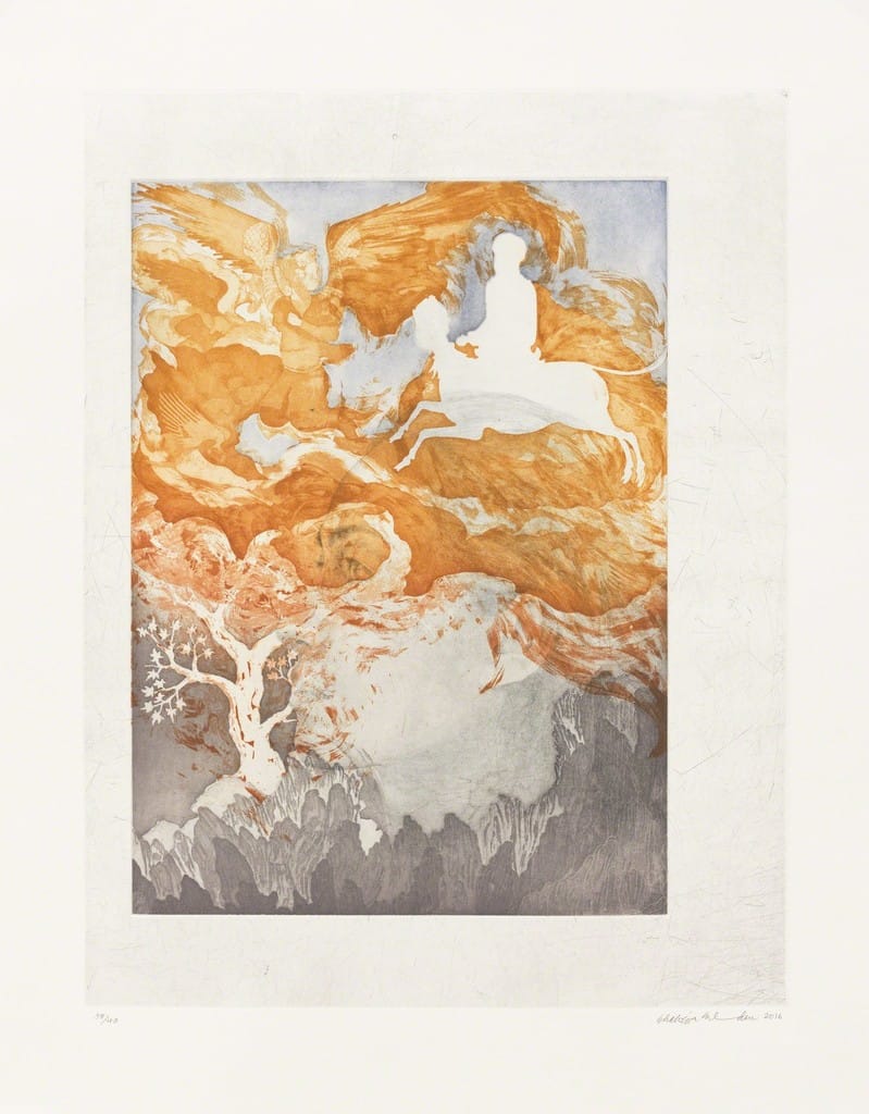 Representations of the artist are generally absent in historical Indo-Persian miniature manuscripts, and while the imagery is often crowded within the picture plane, it is not layered or overlapping. Collectively titled Portrait of the Artist, Sikander’s four-etching suite, which is accompanied by an essay by playwright Ayad Akhtar, subverts the conventions of the miniature genre in multiple ways. The works are palimpsests of symbolic iconography that layer the portraits — two of Sikander herself and two of Akhtar — with the silhouettes of the Prophet and angels. The color palette, evoking celestial skies and deep sunsets, is more subdued than that of traditional miniatures. In one etching, the artist’s three-quarter profile displays a serene hint of a smile, as gold and yellow hues illuminate her gray-toned face. The portrait is superimposed on a silhouette of a figure riding a winged creature, along with outlines of angles within the picture frame. The featureless icons of the Prophet and the angels are recognizable as their style borrows from Central Asian and Indo-Persian miniatures.