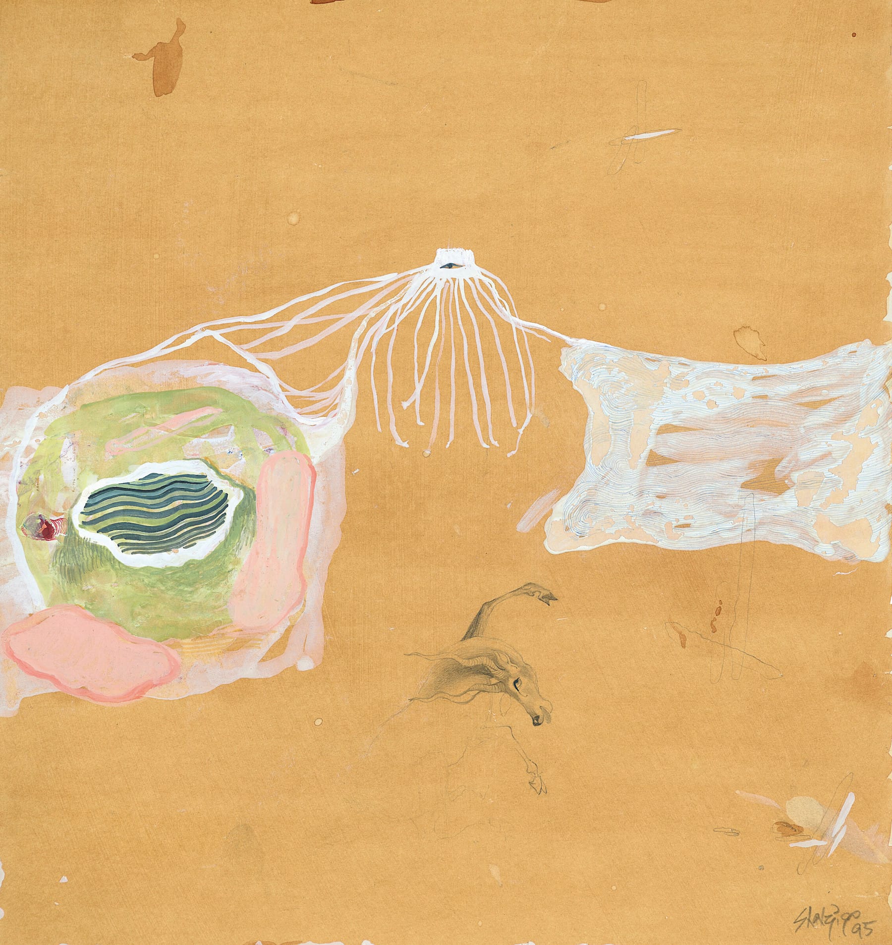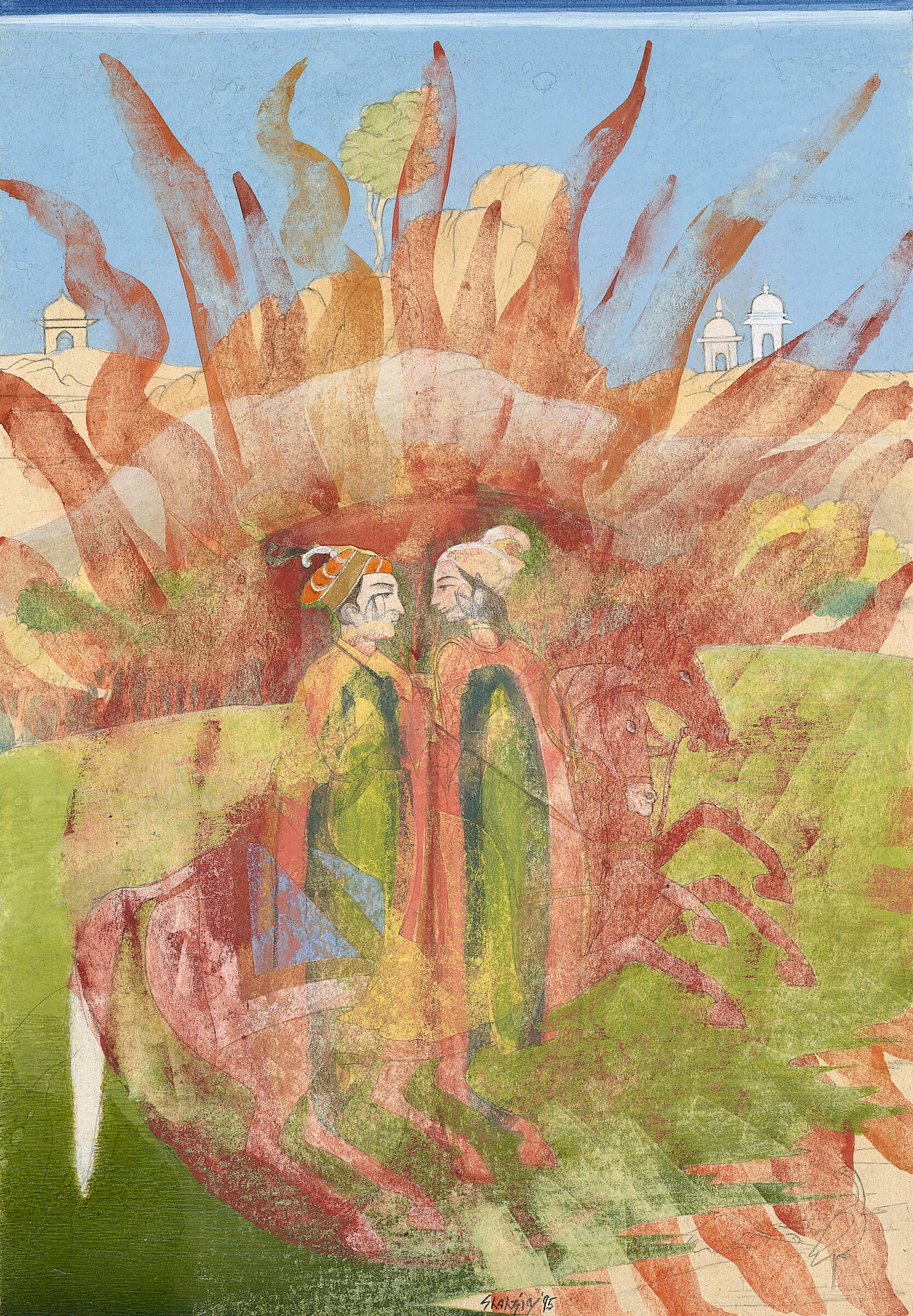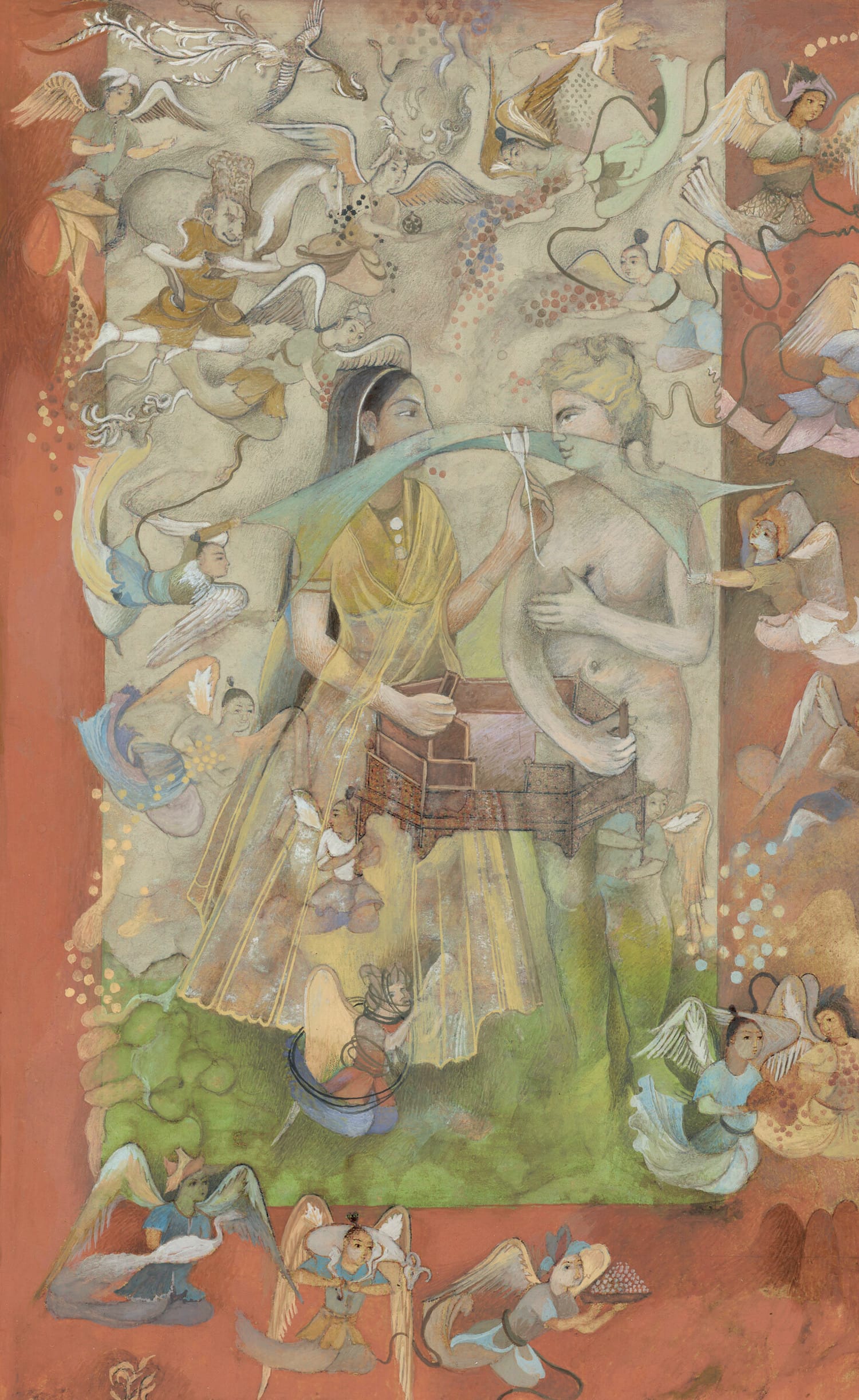 Themes of queer desire continue in Sikander’s painting “Cholee Kay Peechay Kiya? Chunree Kay Neechay Kiya?" (What Is under the Blouse? What Is under the Dress?) (1997), which pictures a multi-limbed, gender-fluid figure. As Gopinath argues, the piece nods to a scene of queer longing in the 1993 Bollywood film Khalnayak in which two women seductively dance together. This work, like many others of Sikander’s, both conceals and reveals queer longing in plain sight. This intricately rendered play with visibility powerfully questions what has historically been considered legible desire.