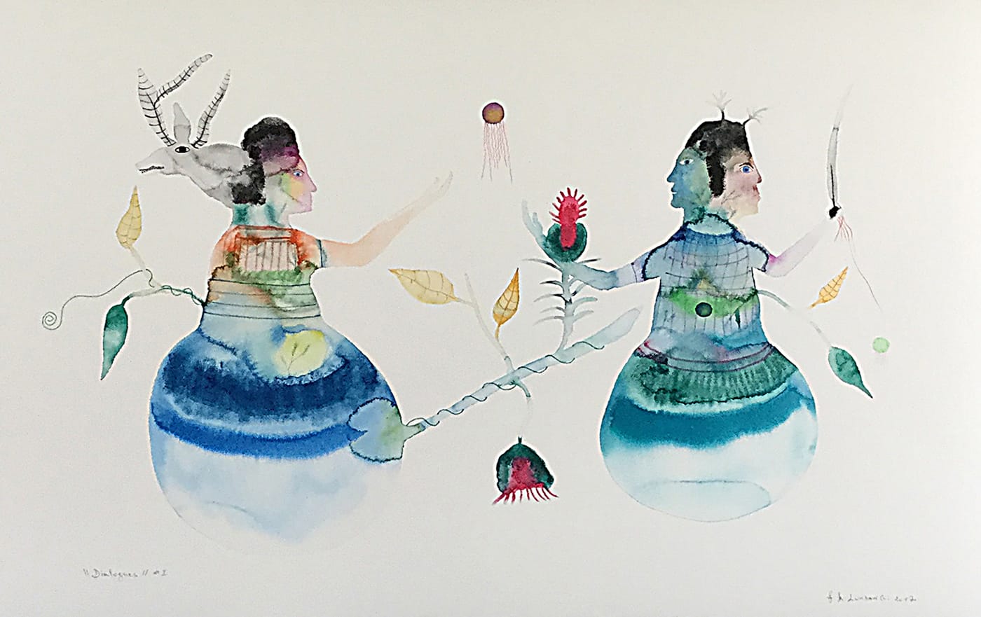 PARIS — Painter and poet Franck Lundangi aims to adjust our mindfulness with Dialogues, his first solo show at Galerie Anne de Villepoix in Paris. Lungangi, who was a participant in the benchmark show Africa Remix: A Continent’s Contemporary Art in 2005–06, seeks to express the harmonious unity typical of human spirituality with jovial paintings like “L’Homme spiritual” (2016). As he told me, he strives to portray connections (dialogues) between humans and nature, joining things together in mystical, magical worlds. This goal is often the case within indigenous African magical traditions, but in speaking with Lundangi I learned that his delicate shamanistic-looking art is not Africa-specific. His focus is on universal humanism as a magical discourse full of imaginary and visionary transactions, as seen in his rather refined aquarelle “Dialogues I” (2017).