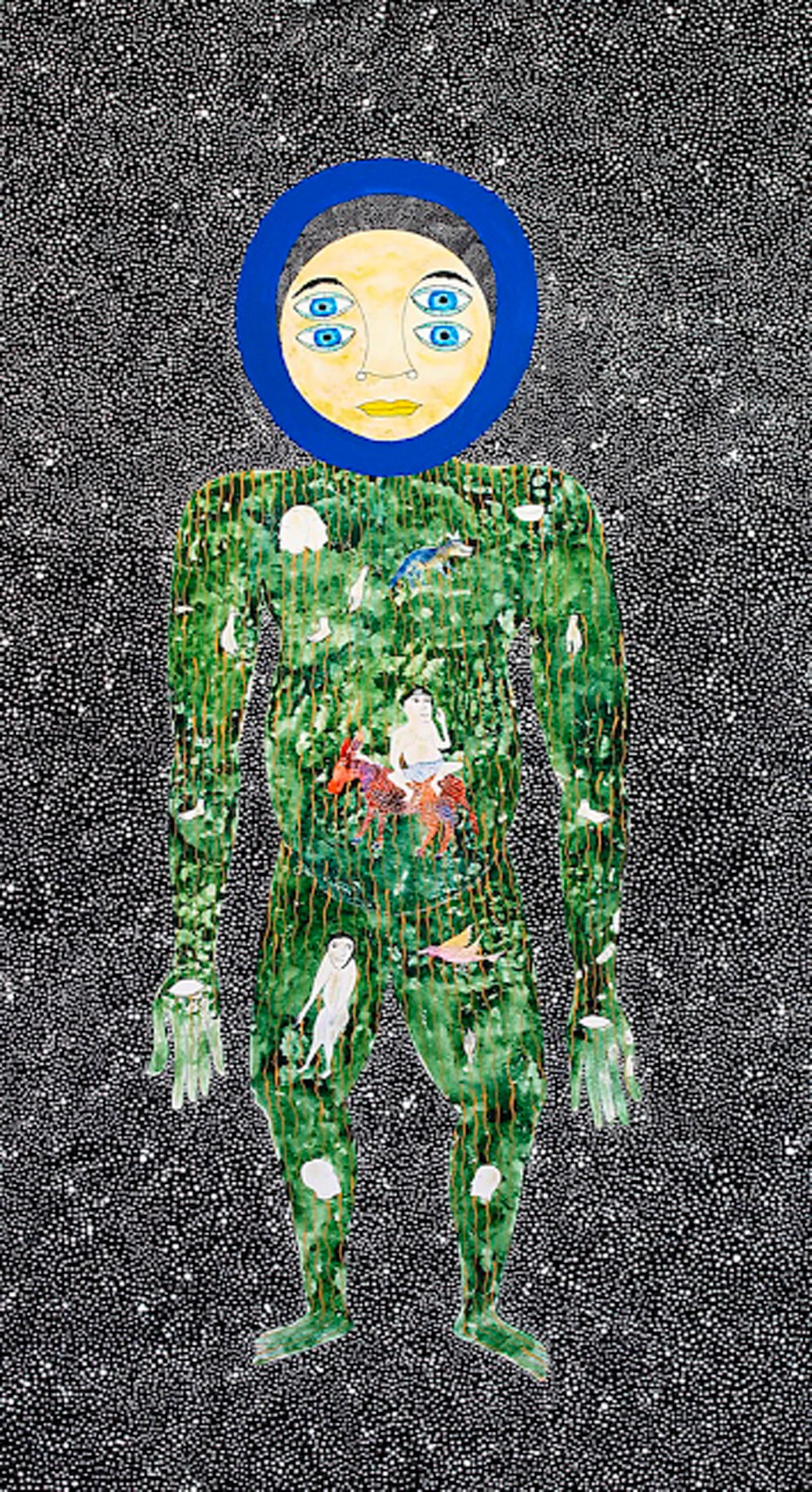 Antonin Artaud said that life is the imitation of a transcendent principle with which art can put us back in communication. Lundangi’s transformation paintings, like “Je me pose des questions” (2017), are transcendent poetic metaphors useful in realizing a greater human potential to connect. All of his images suggest a movement of consciousness toward the union of subject and object. Becoming and apperception seem to be his true magical subjects, the nature of his vibrant figures delineating a metamorphosis that binds together human to human as well as human to natural environment. His scintillating fairy-tale pictures depict nonmaterial, mysterious interchanges that jostle in and around the figures, vying to get upon the stage of the real.