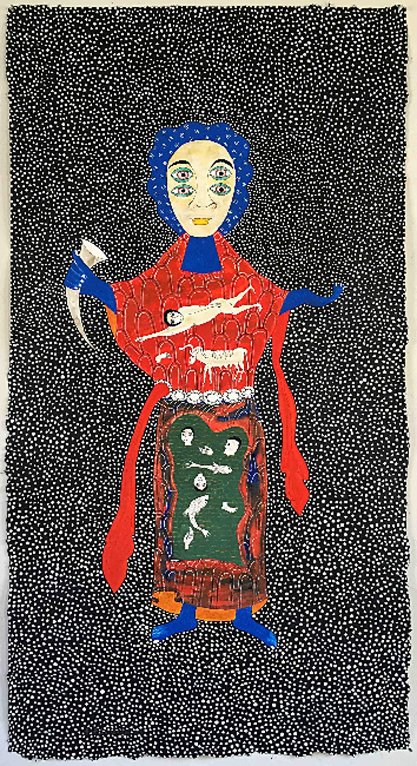 In pieces like “We Know Very Little” (2016), Lungangi’s imaginary frontal figures have smaller figures embedded into them. This multiplicity is, I believe, meant to suggest special states of inner consciousness that, in most magical theories, is needed for working magic. His figures also possess multiple eyes, something often encountered throughout fantastic, mystical, and visionary art. So his forms, though enticing, are not grand departures from older concepts of magic, which also suggest the interdependence of inner and outer energies, or spirits or symbolic acts, as the source of magical powers. This embedded magical dialogue was popularized in Western occultism by Aleister Crowley and further explored in art by chaos magician Austin Osman Spare.