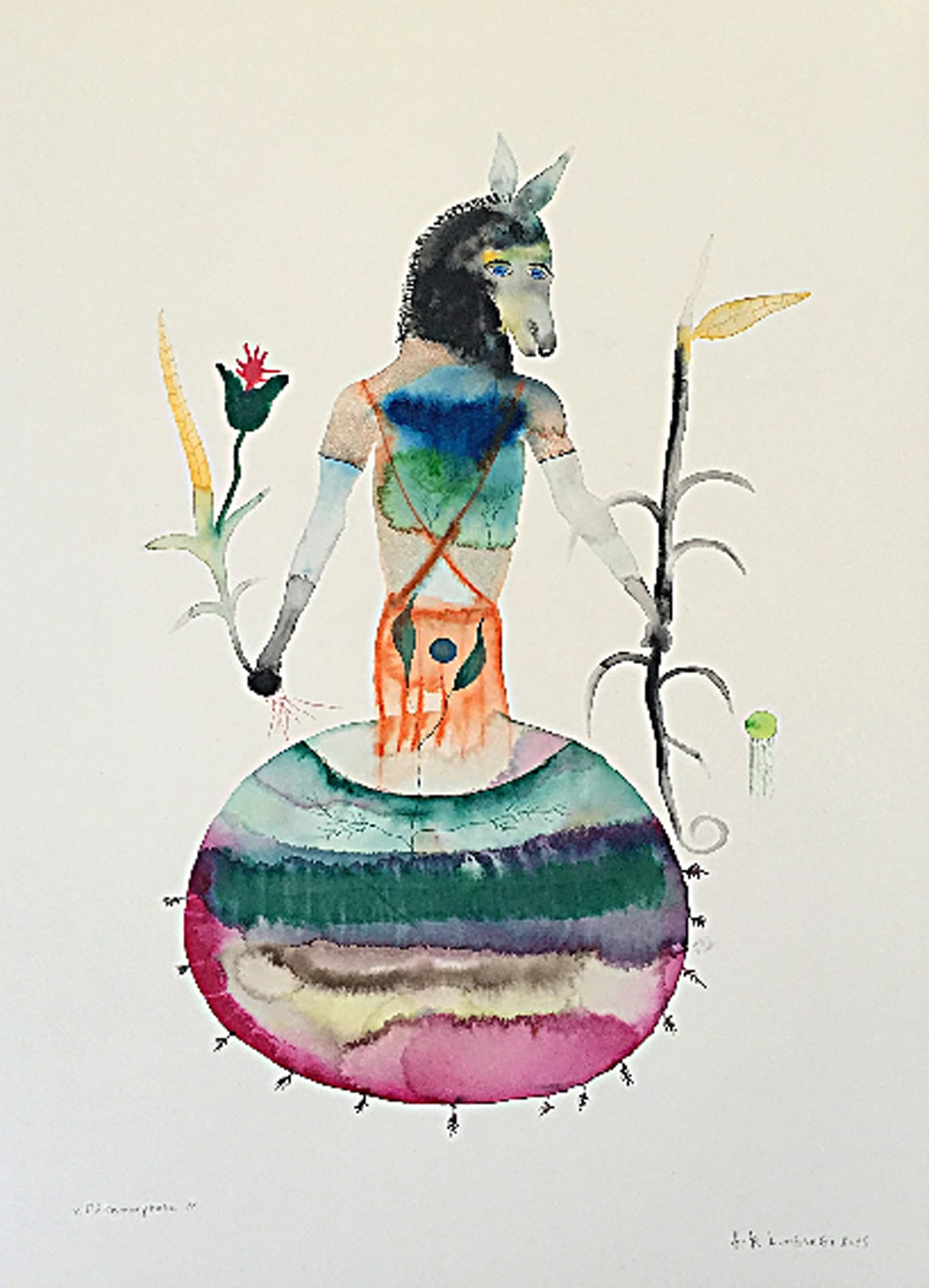As evident in the hydra-headed “Homme racine” (2014), Lundangi’s paintings often stress transformation and hybridization, reminding me of Ovid’s classical poem Metamorphosis. Like Ovid, Lundangi’s aquarelle “Métamorphose” (2016) is in fact a horse-headed provocation to think beyond static form, to imagine and dream across boundaries.