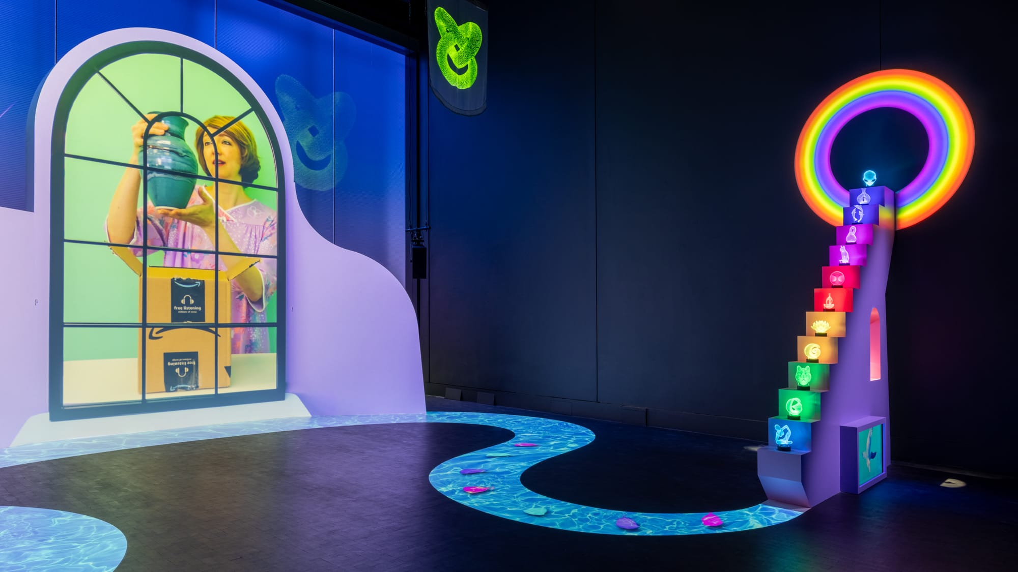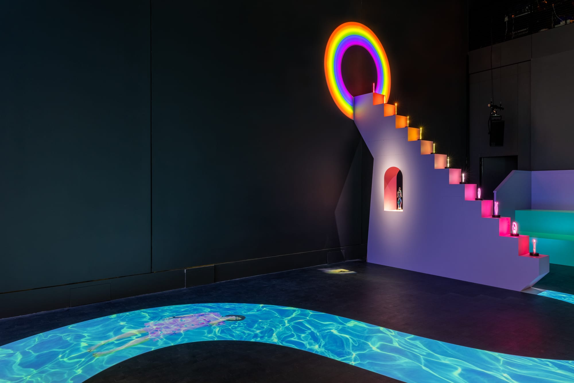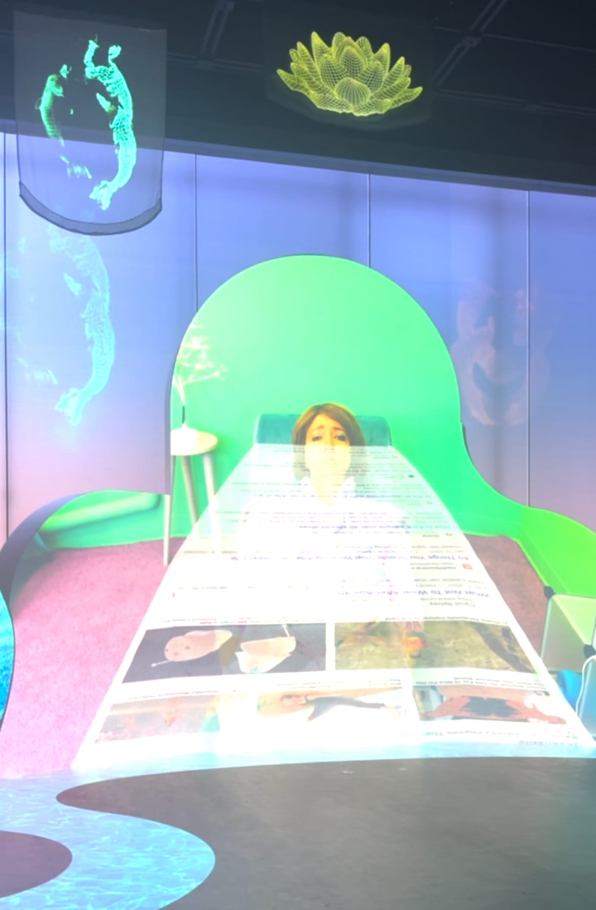 As Meta/Physical Therapy opens, Cynthia, resplendent in a floral housedress, receives a package: an Amazon box, that icon of American convenience culture. She struggles to find a place for its contents, a rather generic-looking teal-green ceramic vase, in an electric pastel-hued room — a full-scale, video projection-mapped theatrical set — filled with other kitschy, mass-market trinkets. Fitted with cheap, retail-style shelving, a snake plant, and a plush, amorphously shaped chaise, the room feels at once like a late-model gynecologist’s office and a new-age sex shop — a space whose aggressively soft design sensibility demands that one should simply relax, even as its purpose inspires anxiety. Cynthia steps off set for a moment and reappears wearing a sort of remote-controlled heating apparatus around her neck, one we can only assume she mail-ordered. With a push of a button, an office-style ergonomic laptop table appears, and she lounges on the chaise, frantically Googling “Where should I put my vase?” A streaming page of search results — an endless glut of content related to various ailments, menopause, and middle age — physically overwhelms her, giving way to the hallucinatory journey that follows.