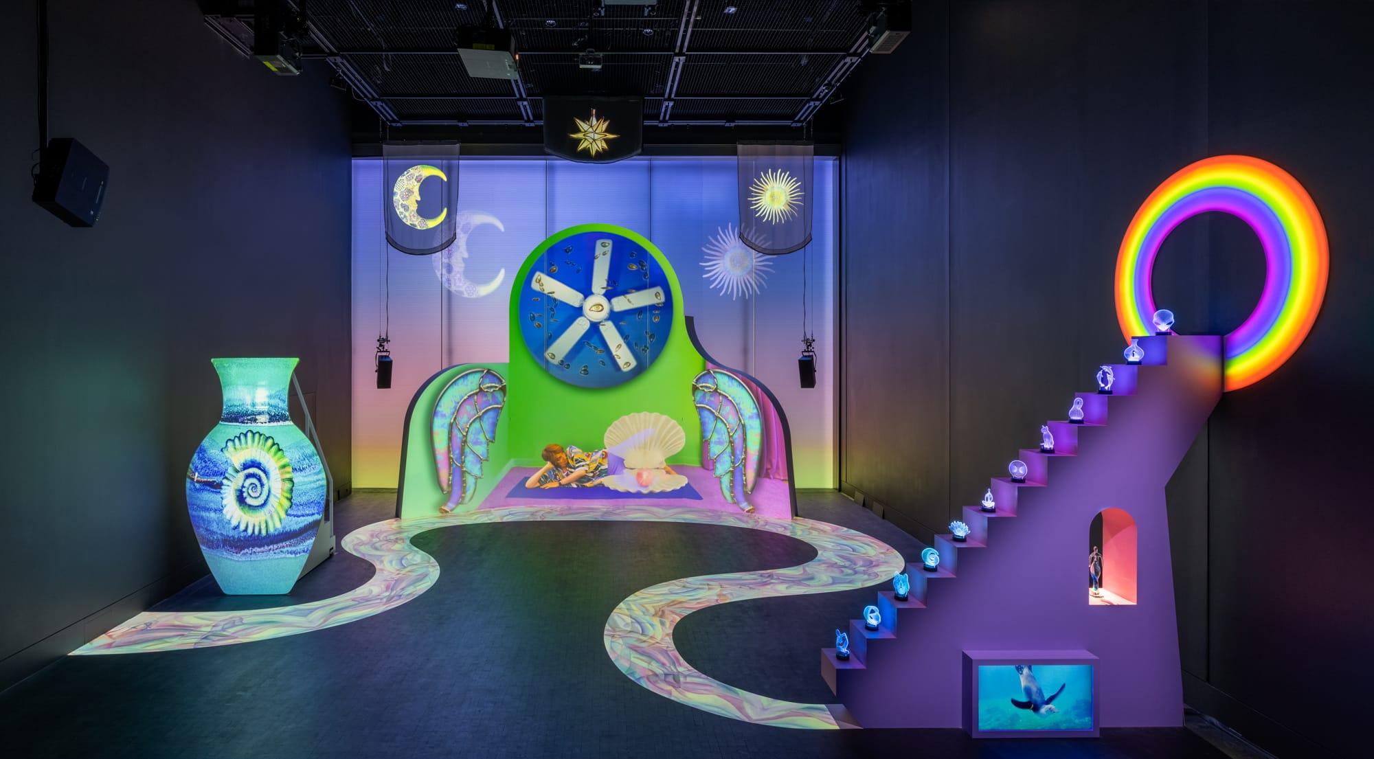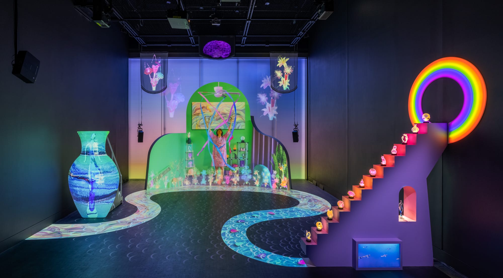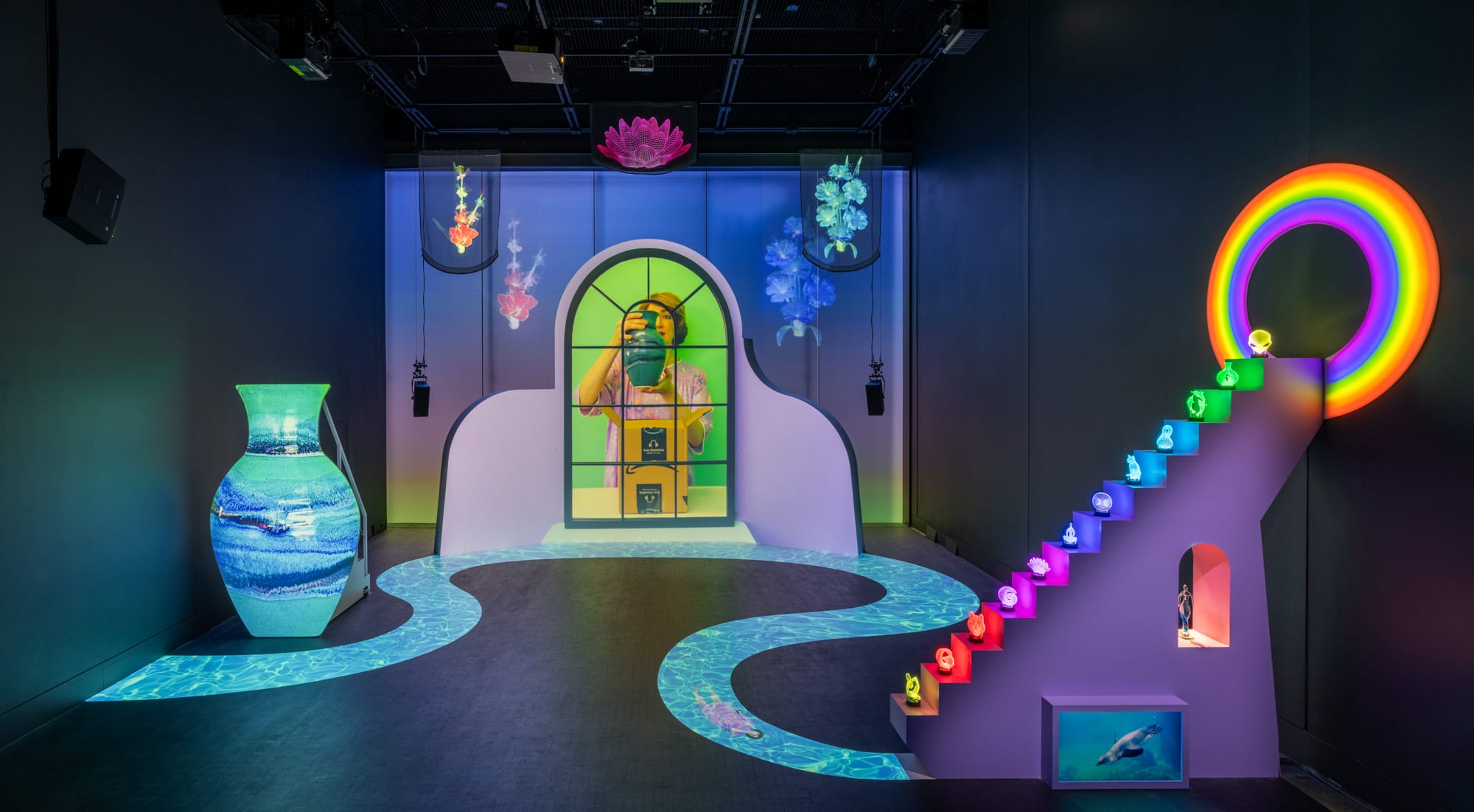 As Meta/Physical Therapy opens, Cynthia, resplendent in a floral housedress, receives a package: an Amazon box, that icon of American convenience culture. She struggles to find a place for its contents, a rather generic-looking teal-green ceramic vase, in an electric pastel-hued room — a full-scale, video projection-mapped theatrical set — filled with other kitschy, mass-market trinkets. Fitted with cheap, retail-style shelving, a snake plant, and a plush, amorphously shaped chaise, the room feels at once like a late-model gynecologist’s office and a new-age sex shop — a space whose aggressively soft design sensibility demands that one should simply relax, even as its purpose inspires anxiety. Cynthia steps off set for a moment and reappears wearing a sort of remote-controlled heating apparatus around her neck, one we can only assume she mail-ordered. With a push of a button, an office-style ergonomic laptop table appears, and she lounges on the chaise, frantically Googling “Where should I put my vase?” A streaming page of search results — an endless glut of content related to various ailments, menopause, and middle age — physically overwhelms her, giving way to the hallucinatory journey that follows.