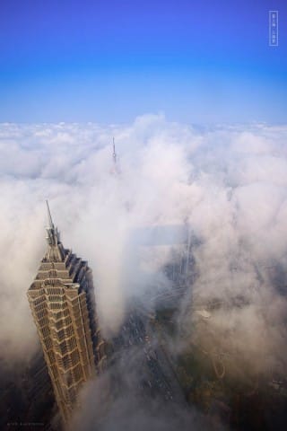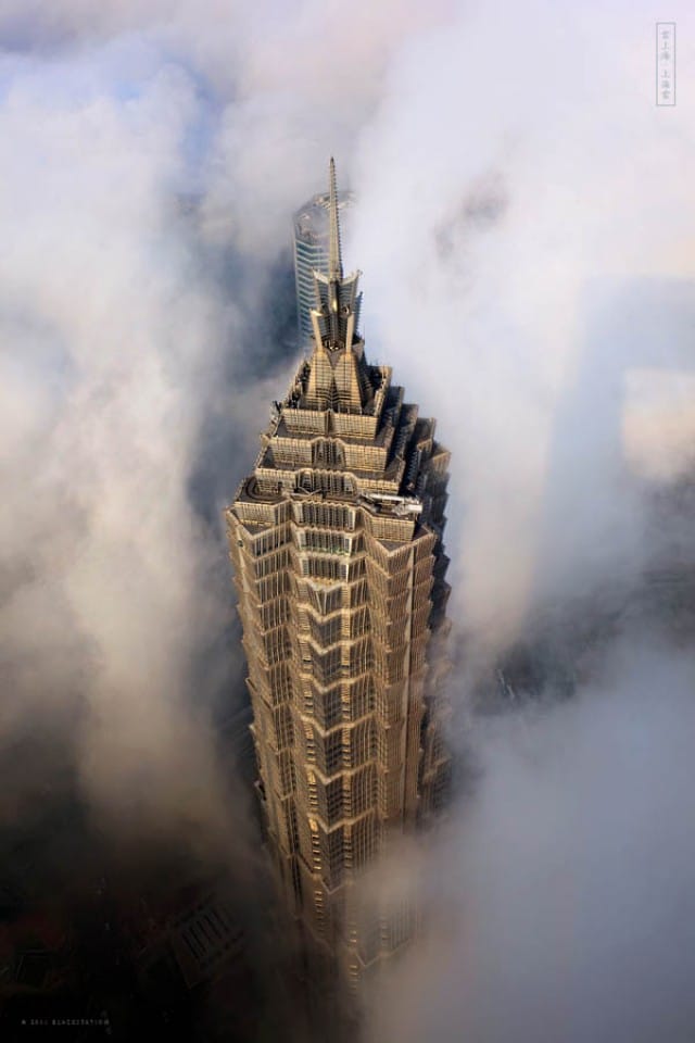 A little while back I came across the work of Shanghai-based photographer Blackstation, aka Wang Dong. Wang, a graphic designer, took these stellar photos of some of Shanghai’s more iconic skyscrapers, each of them enveloped in mist. The two he’s focused on are the Jin Mao Tower (1,380 feet) and the Shanghai World Financial Center (1,614 feet), with glimpses of the iconic Oriental Pearl Tower.