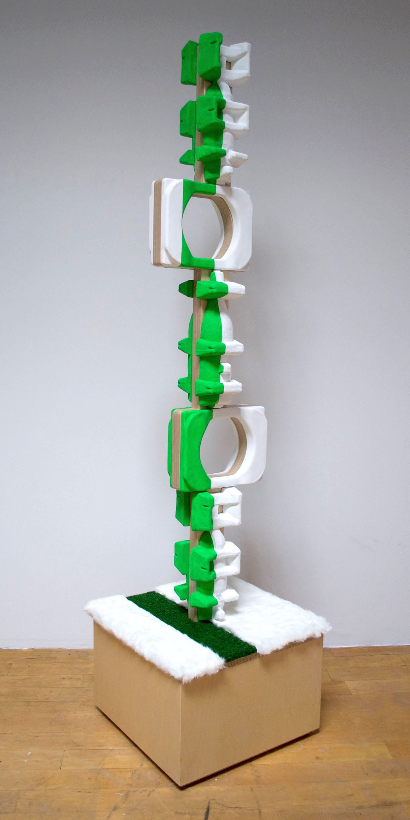 Most of the cast forms, in this work and the other sculptures, are derived from various extruded-foam and molded-pulp void fills of the kind used in the packaging of small appliances and other consumer durables. In “Alien” (Hydrocal, Flashe, synthetic turf, fake fur, plywood; 73 x 19 x 19 inches), several of these are attached to a hefty, impeccably crafted plywood armature that stands upright on a sleek, cubic base.