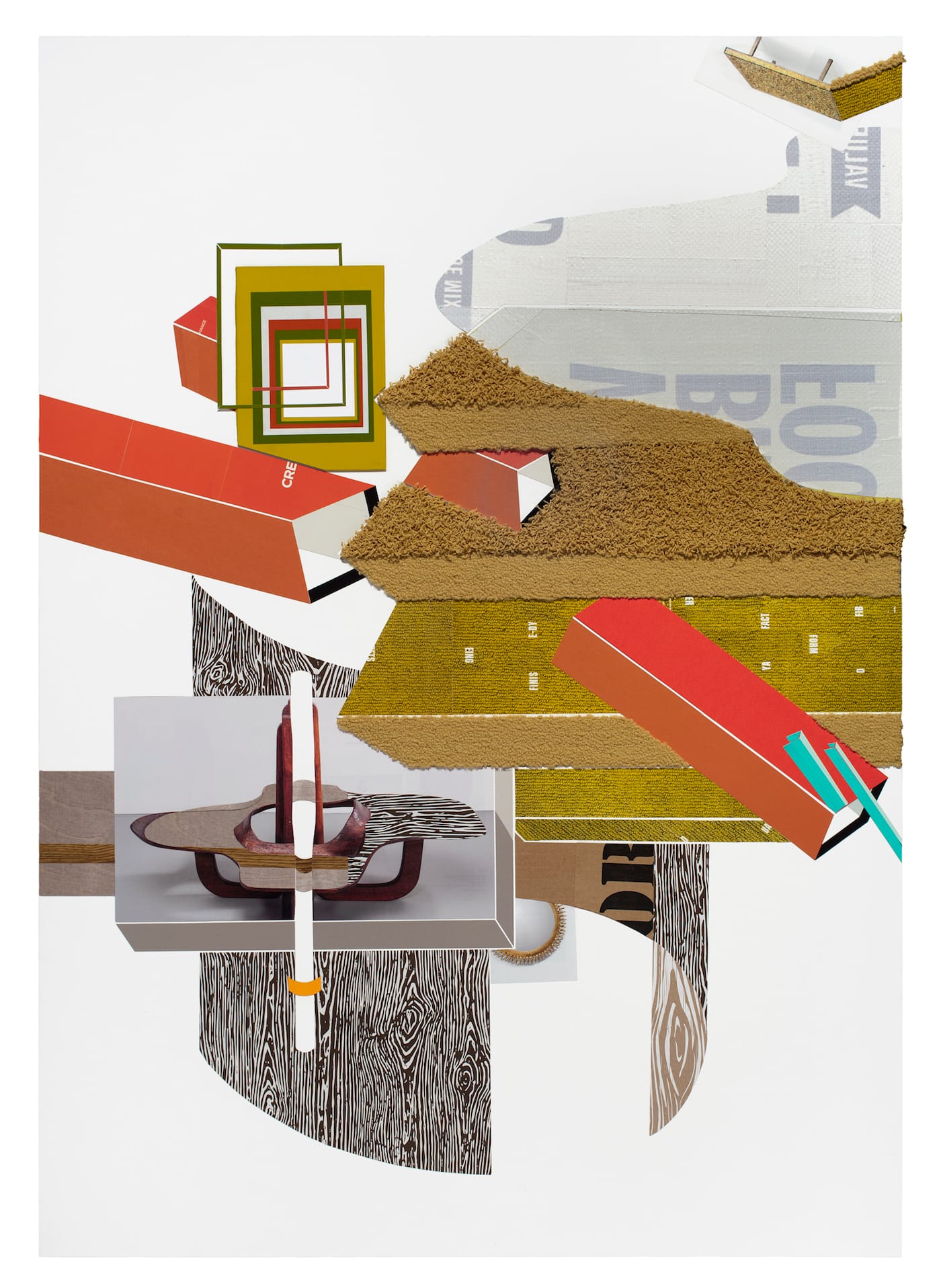 Like collage in general, Lawless’s come out of Cubism, but rather than “an explosion in a shingle factory” (per Julian Street of The New York Times, c. 1913), these look more like products of some recondite algorithm dredging for the look and feel of the postmodern built environment. In “cre (October)” (57 x 40 inches; all works 2017) rectangles and parallelograms are tossed together, some of which cohere into a set of carpeted steps (a luxe Stairmaster?), along with faux wood grain; the titular word fragment as well as several other monosyllabic formations, including “OOF” and “OB”; and an inset image of an inexplicable piece of furniture that seems to combine a midcentury coffee table and a prosthetic device of some kind.