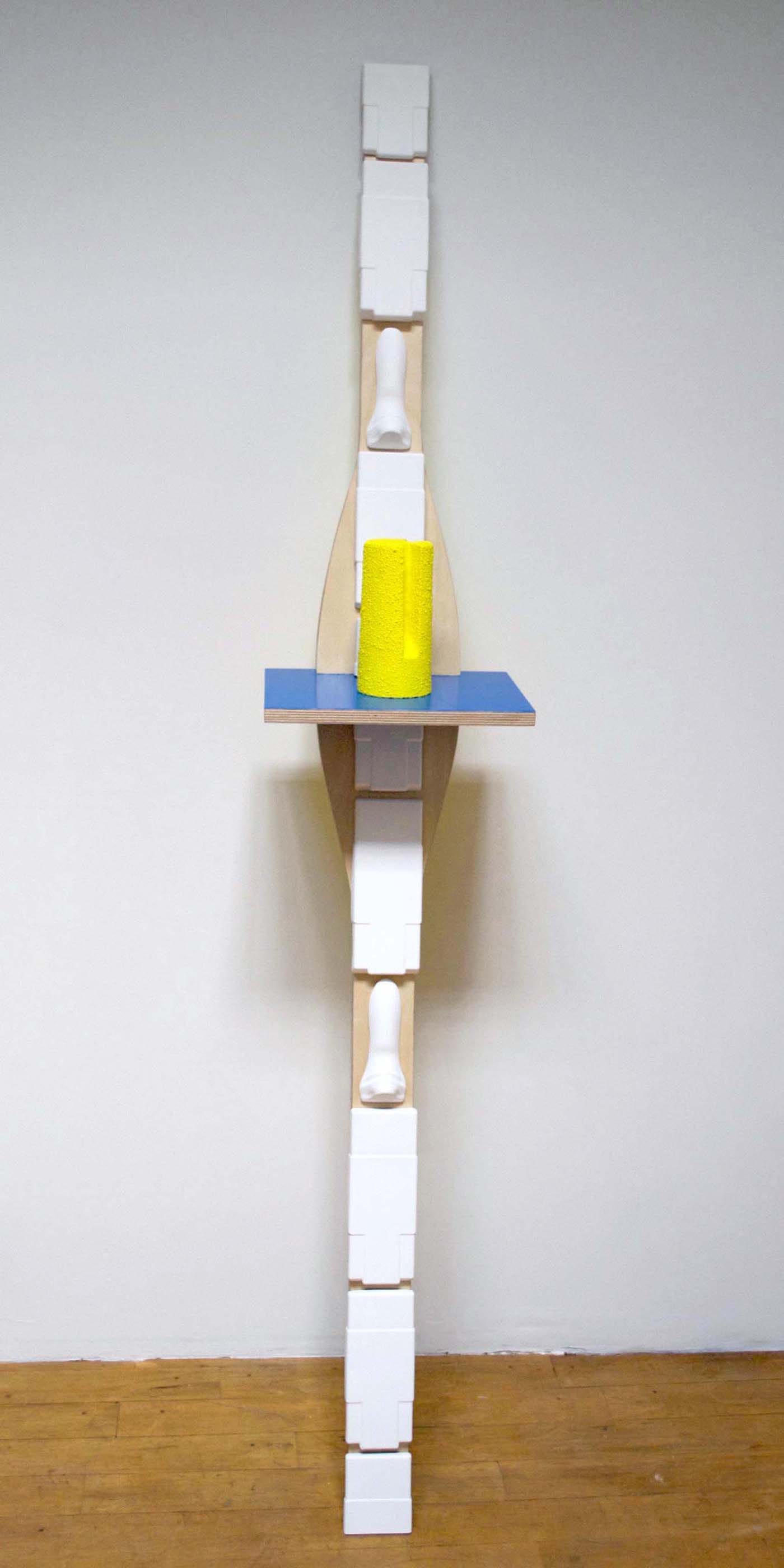 The sculptures don’t exactly bounce off the wall, though one leans against it, at about a 15-degree angle. Titled “Semaphore” (Hydrocal, Flashe, acrylic and latex paint on plywood armature; 72 x 12 x 13 inches), it’s essentially a narrow plywood plank with a bulbous midsection, mitered at the top and bottom for stability and festooned with inscrutable, flattish, chalk-white objects. On a blue horizontal shelf at the vertical midpoint rests a lemon yellow cylinder a few inches across; a similar form protrudes from the back, toward the wall. The work’s symmetry imparts a sober, ceremonial tone quite different from the pictures, though there is a similar sense of disparate parts being marshaled into an unlikely whole.