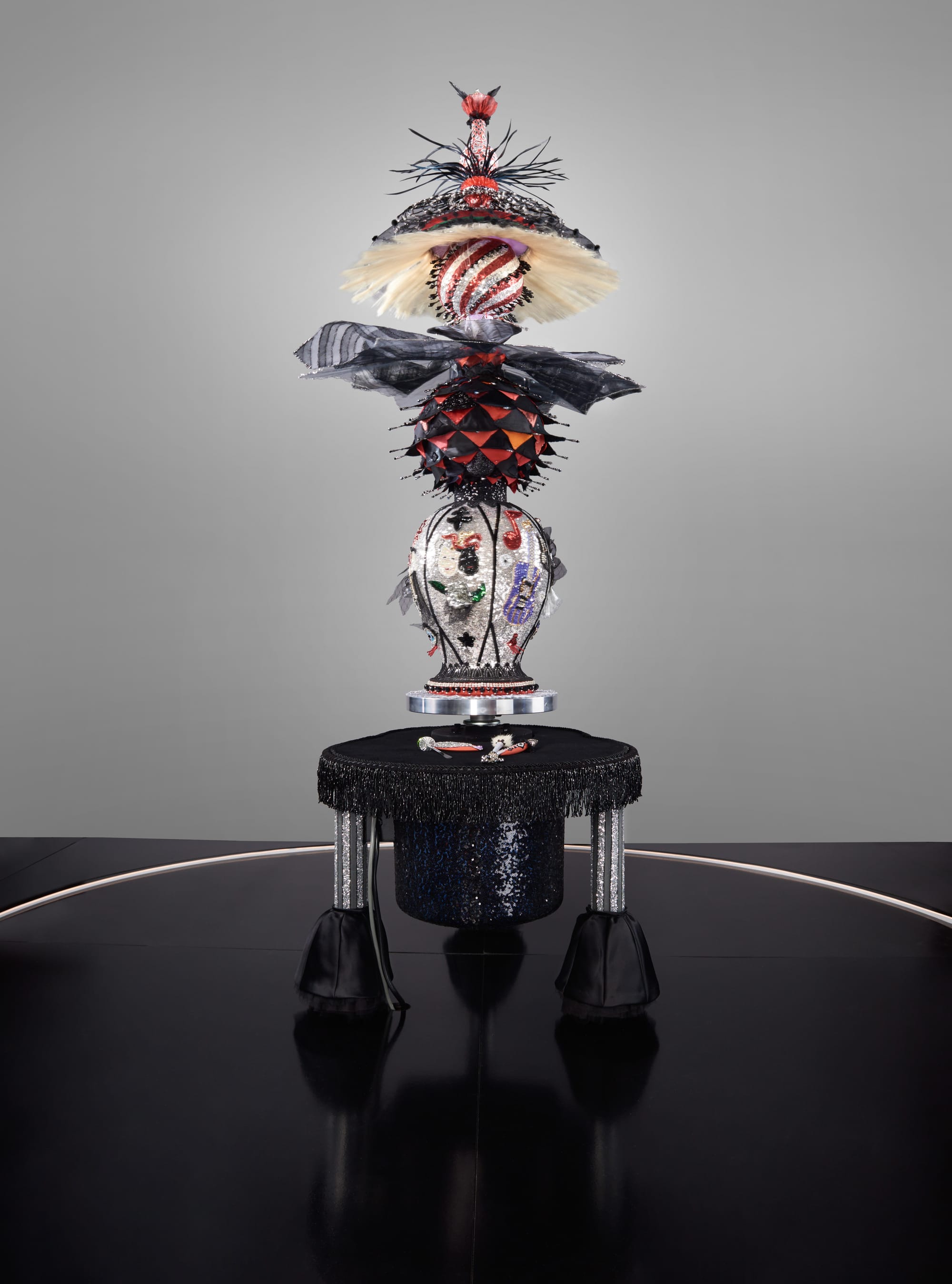 Adopting the structures of theatre, Outside the Palace of Me hopes to function as a metaphor for the construction and presentation of self. Within its confines, the audience is intended to alternate between the role of observer and observed as they engage with an array of uncanny characters and objects — from the miniature to the monumental. Boyle’s small-scale clay sculptures are placed throughout the exhibition, including “The Procession” (2020), an installation of 28 stoneware figures that aims to honor the spirit of collective action. “White Elephant” (2021) is a gigantic, seated figure dressed in a knitted sweater and woolen trousers. The figure’s porcelain head rapidly spins 360 degrees when triggered by a motion detector activated by a passing visitor. “Centering” (2021), a coin-operated pottery wheel sculpture built of wood, textiles, beads, crystals, feathers, human hair, sequins, mirror, and electronics, spins when its foot pedal is pressed.