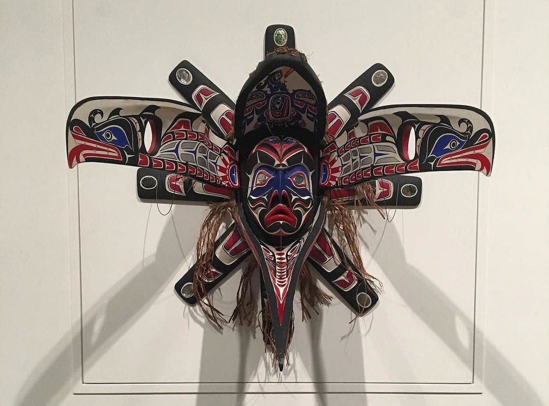 The form of the mask is based on historic Northwest Coast transformation masks, ceremonial regalia used in dances by many tribes up and down the coast. In the gallery, Hunt’s mask has been juxtaposed with “Eagle Transformation Mask” (1990) by famed Haida artist Robert Davidson, to demonstrate Hunt’s departure from more canonical and traditionalist approaches to mask-making. But the better comparison to capture the spirit of the transformation mask is downstairs, where the museum’s dimly lit collection of historic Northwest Coast masks includes “Raven Transformation Mask” (c.1860-80) by an unknown Nuxalk artist. Such masks captured the imagination of Euro-American artists and anthropologists with their ingenious construction: by pulling a series of draw-strings, the wearer can pull the beak apart to theatrically reveal another face hidden inside.