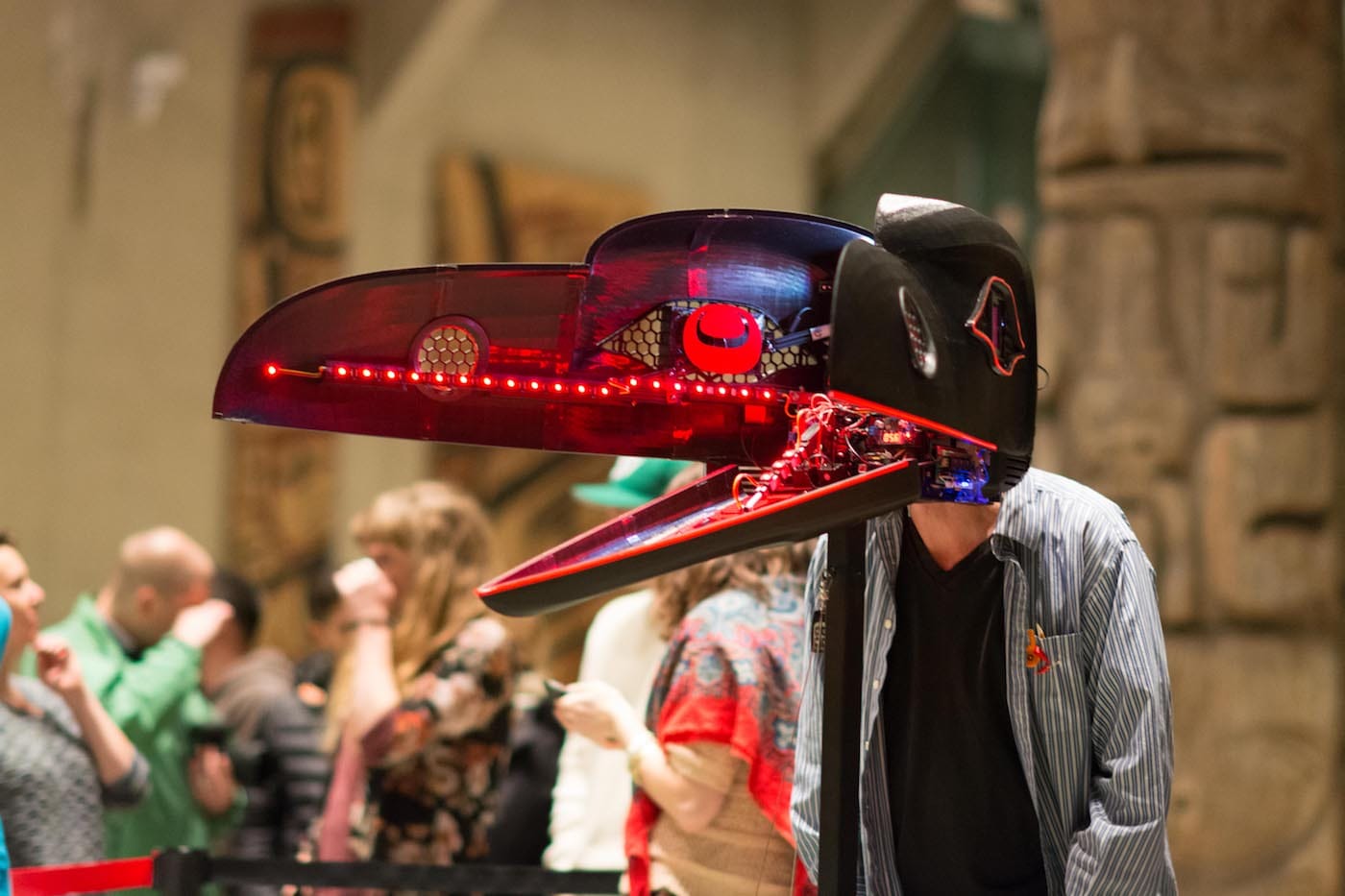 WHISTLER, British Columbia — In an exhibition closing today at the Audain Art Museum in Whistler, Canada, visitors encounter a sleek black robotic Raven mask, its plastic 3D-printed beak and head highlighted with strips of bright LEDs. Its eyes are phone screens, animated with emotive red pupils as if the trickster-figure Raven has taken on the guise of an 80s-era Terminator.