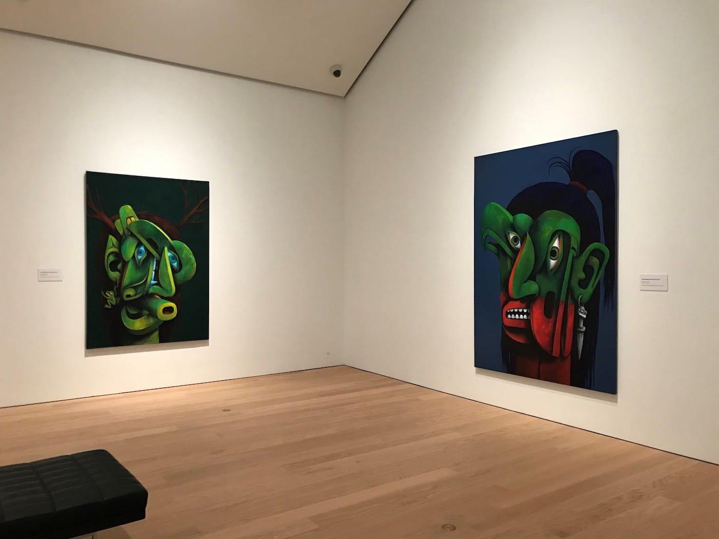 Hunt has explored the boundaries of formline design for much of his career. Also in the exhibition are two grisaille paintings from 2016, which show sinuous ghostly figures who seem to be themselves mid-transformation, as human and animal faces emerge at different points of their torsos. Hunt describes these works as “neo-formline.” The current exhibition also overlooks a gallery in the permanent collection that houses two of Hunt’s earlier paintings, “Traditional Evolution. Raven Steals My Light” and “Supermarket Eagle” (both 2013). The result could be considered a pop-up retrospective of Hunt’s recent oeuvre.