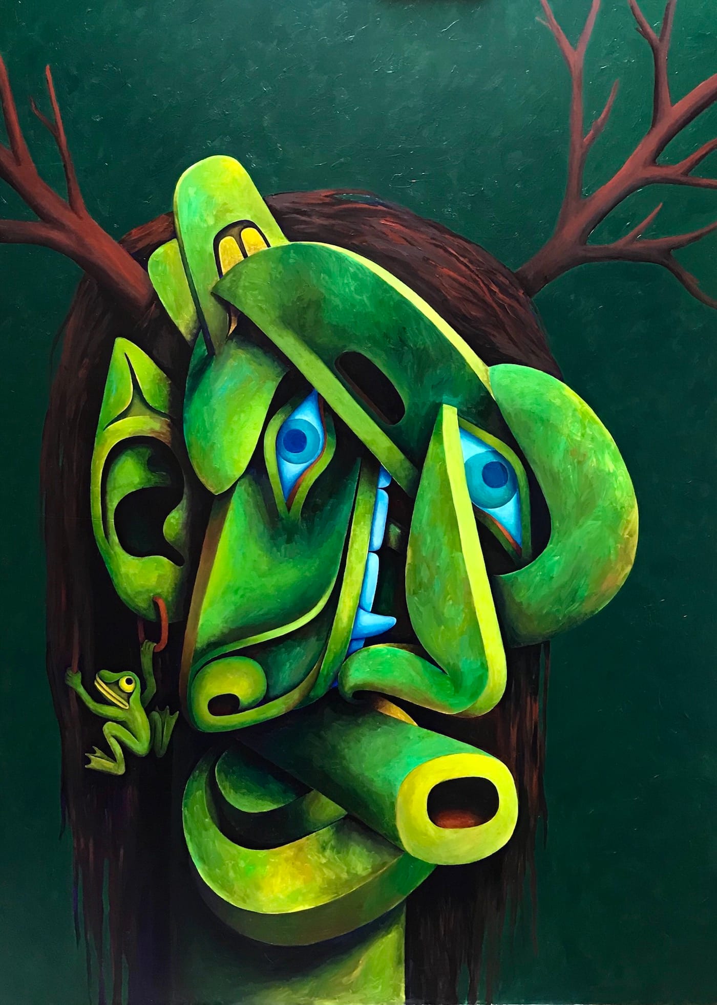 The influence of Euro-American modernism is clear in these paintings — the fragmented planes and projecting volumes of the faces seem Cubist, while the naturalism combined with mythical archetypes and dream-like figures recalls Surrealism. Many Surrealists took a keen interest in Northwest Coast Native art. “Modernists looked towards Indigenous art to begin to fracture the face and human body and create something new,” Hunt said. “They took our art and incorporated it into their work to evolve what we know as art. So I find it interesting to take it back, full circle.”