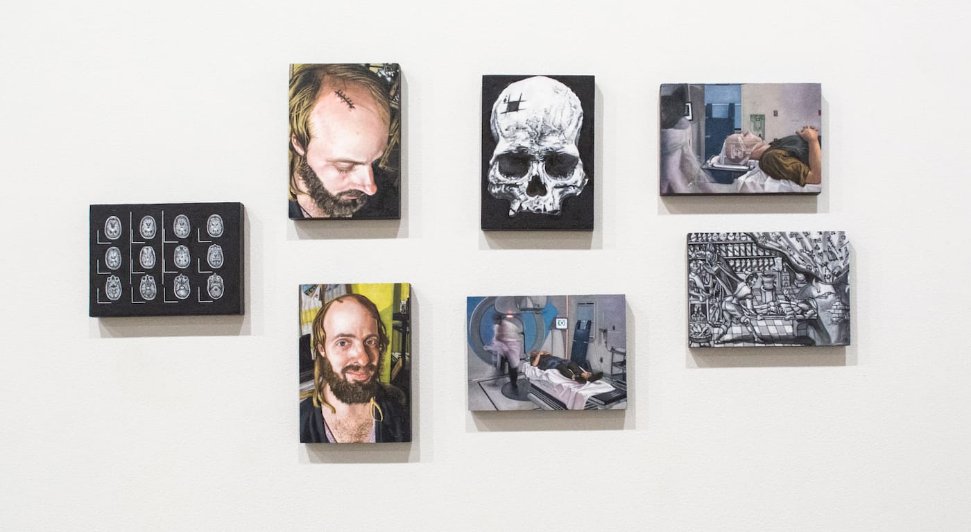 This is how Burckhardt describes what the artist is up to: “Thornton creates a Gesamtkunstwerk around his life and studio, making paintings, music, ritual-like pop objects, and clothes. All of this in service of rebuilding his metal pathways after a serious illness — a kind of tantric idea of how to hold an image in one’s mind as a tool of consciousness.” The serious illness Burckhardt cites necessitated the surgical removal of the artist’s pineal gland ten years ago. Five of the seven paintings refer to events shortly before and after the surgery. They include a painting of twelve brain scans arranged in a grid, two self-portraits showing his scar, and two others that depict him waiting to be pushed into an MRI machine. The other two paintings bring the whole group into someplace unexpected. One is titled “Trepanned Skull” and features skull with a hashtag carved into its forehead, and the other, which is based on an anonymous engraving from the 1600s, is called “Expulsion of the Demons.” In this grisaille painting, a man lying on a stretcher is shoved into an oven-like enclosure that bears an uncanny resemblance to an MRI scanner.