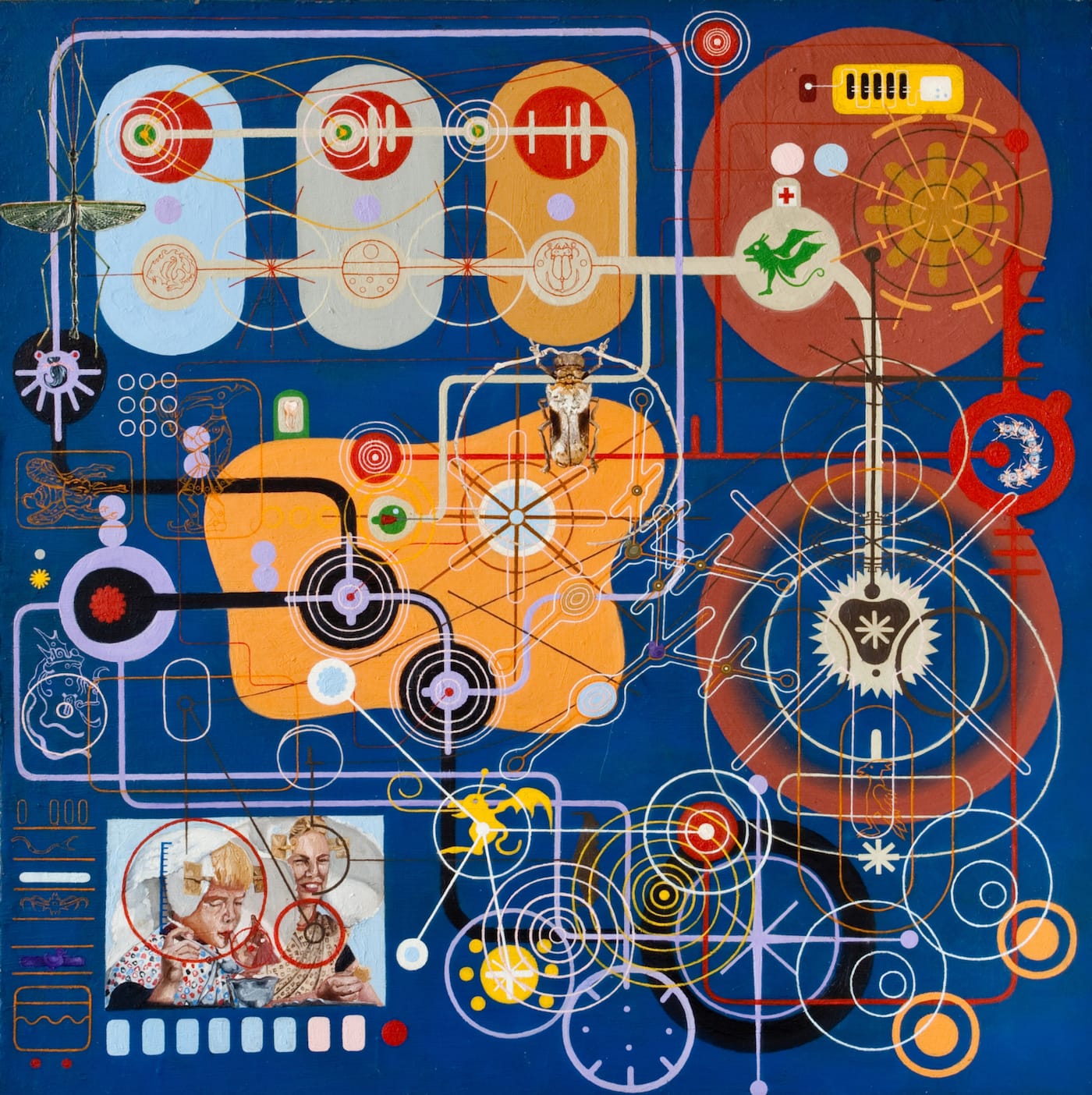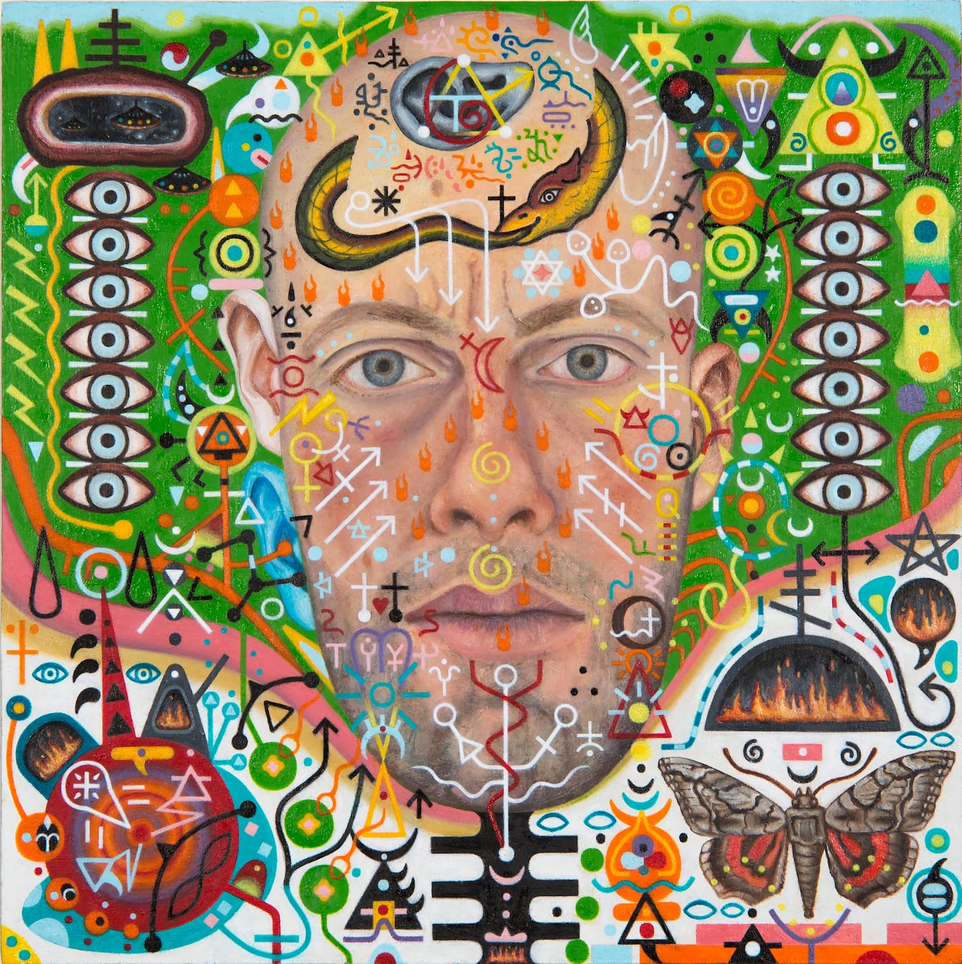 Thornton’s art is the result of his research into the ways different religious traditions convey the underlying nature of mystical and occult experiences. Bringing together different kinds of visual signs, images, art historical references (particularly Renaissance art), and realism, his work is syncretic, with a layered, compressed density comparable to Adolf Wölfli’s intricate and complex compositions. The difference is that Wölfli worked in colored pencils on paper, with his largely symmetrical works conveying a horror vacui that culminates in a feeling of inescapable claustrophobia, while Thornton works in oil on panel, which affords him some breathing room as he layers his compositions with elaborate linear patterns and repeated images and signs. You cannot enter a Wölfli work, but you can imagine roaming through one of Thornton’s layered paintings.