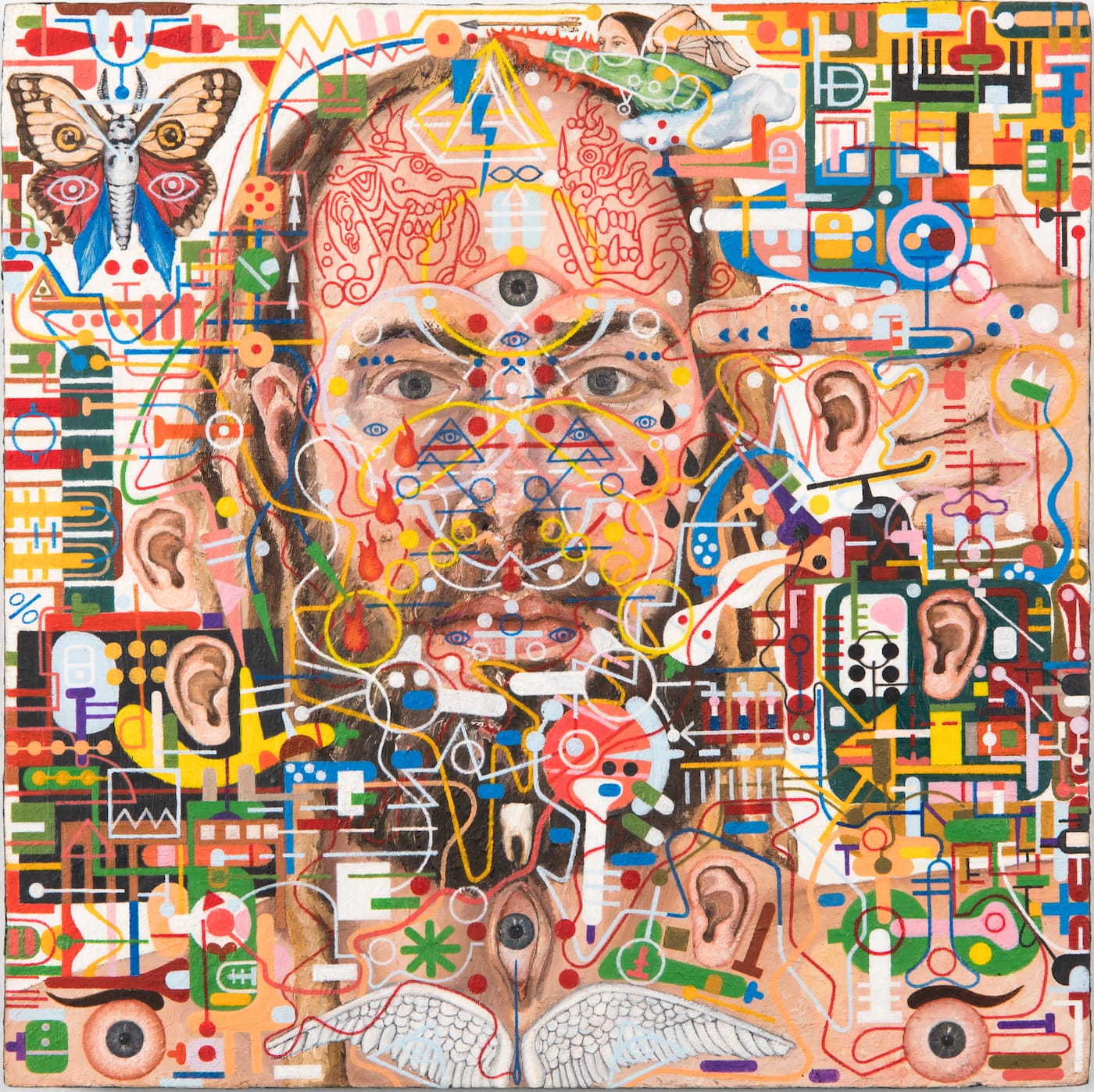 Thornton has likened his work to a “cosmos of small tantric paintings that come together as anthropomorphic circuit boards.” In a number of the paintings, he overlays these circuit boards onto his self-portrait, so that they become tattoo-like markings that extend beyond his face. While many of the symbols are now familiar to us, Thornton’s repetition of them imbues the work with throbbing presence, a visual hum. Urgency, patience, faith, and control manifest themselves as a detailed map of his splintered journey and the prayer that accompanies him. The voyage he has undertaken gestures towards the aether, even as he turns inward.