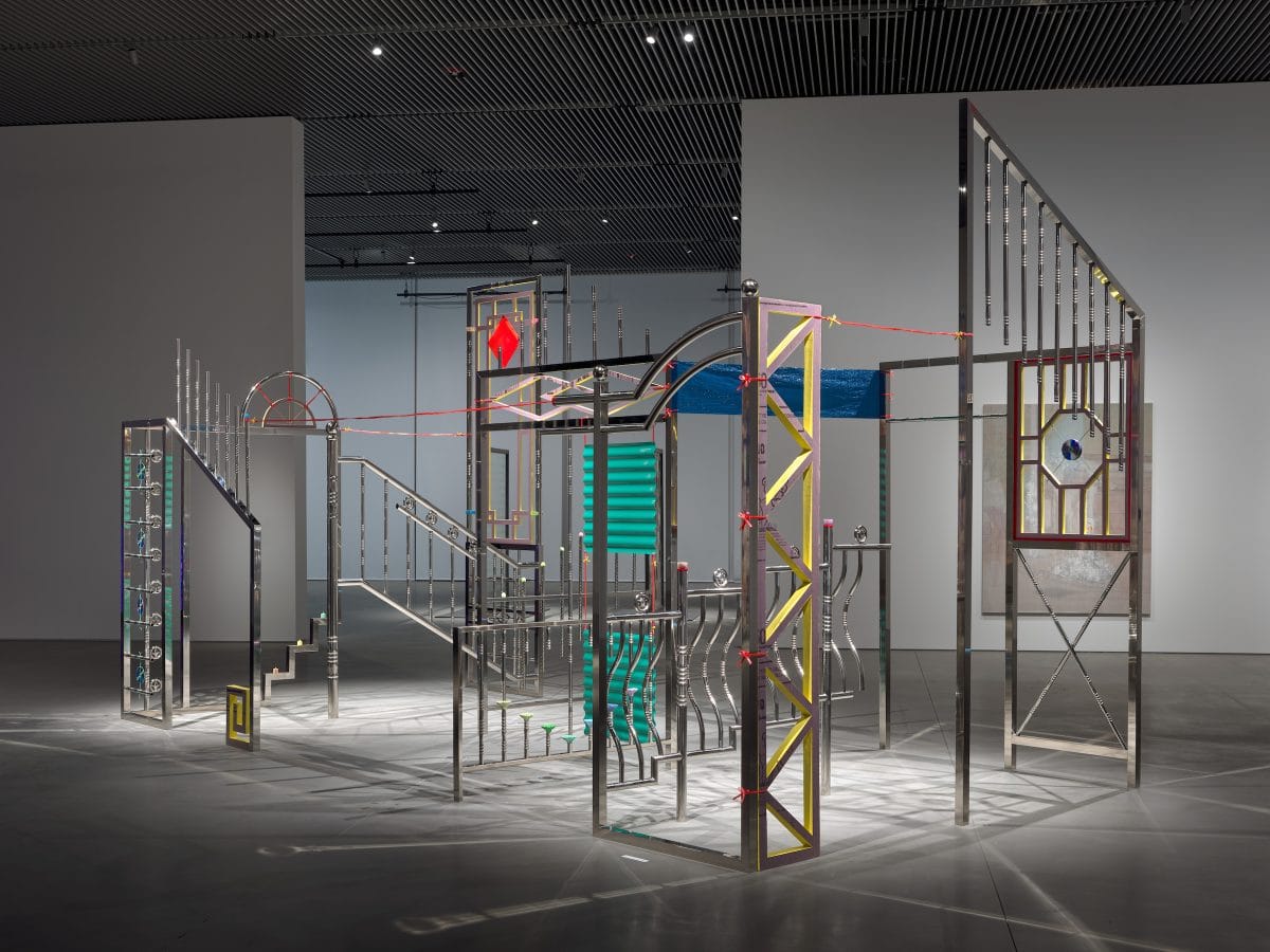 Triangulating Tam’s work are two other monumental installations that explore a multitude of Chinese American experiences. “The Tomb Sweeper’s Mosquito Bite,” a felted tapestry by Taiwanese American artist Pauline Shaw also explores Taoist principles in its consideration of embodied memories and cultural heritage. Hanging seventeen feet tall, the fiber work depicts MRI scans as mappings of memories, surrounded by levitating blown glass vessels holding sugar-cast fruits and Taoist altar items. Nearby, Anne Wu’s massive jungle gym, “A Patterned Universe,” sprawls in joyous defiance. The metallic sculptural installation celebrates Flushing, Queens’s distinct architectural style through its use of stainless steel, construction materials such as PVC roof panels, and household items like laundry clips, discs, and plastic packing rope. Collectively, the artists grapple with cultural disidentifications and an almost creolized sense of self in consideration of their claim to New York.