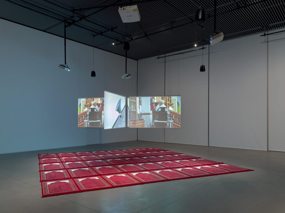 Other works in the show similarly focus on local New York communities. In the rear viewing room, artist and filmmaker Aisha Amin’s video installation offers a visit to Masjid At-Taqwa, a historic Bedford-Stuyvesant mosque now facing the threat of gentrification. “The Earth Has Been Made a Place of Prayer” reworks the artist's eponymous documentary into an immersive four-channel installation, displaying the short film on intersecting screens that hang above 40 Islamic prayer mats, all laid pointing towards Mecca. Intercut with observational footage and interviews of the mosque’s founder Imam Siraj Wahhaj, the work paints a colorful portrait of the intergenerational and multicultural community built around the masjid. Watching the film seated on the prayer mat I am offered a seat in a place of devotion, a semblance of what the mosque offers itself. Here and elsewhere, Open Call offers an ode to communities lost in time but immortalized through memory.