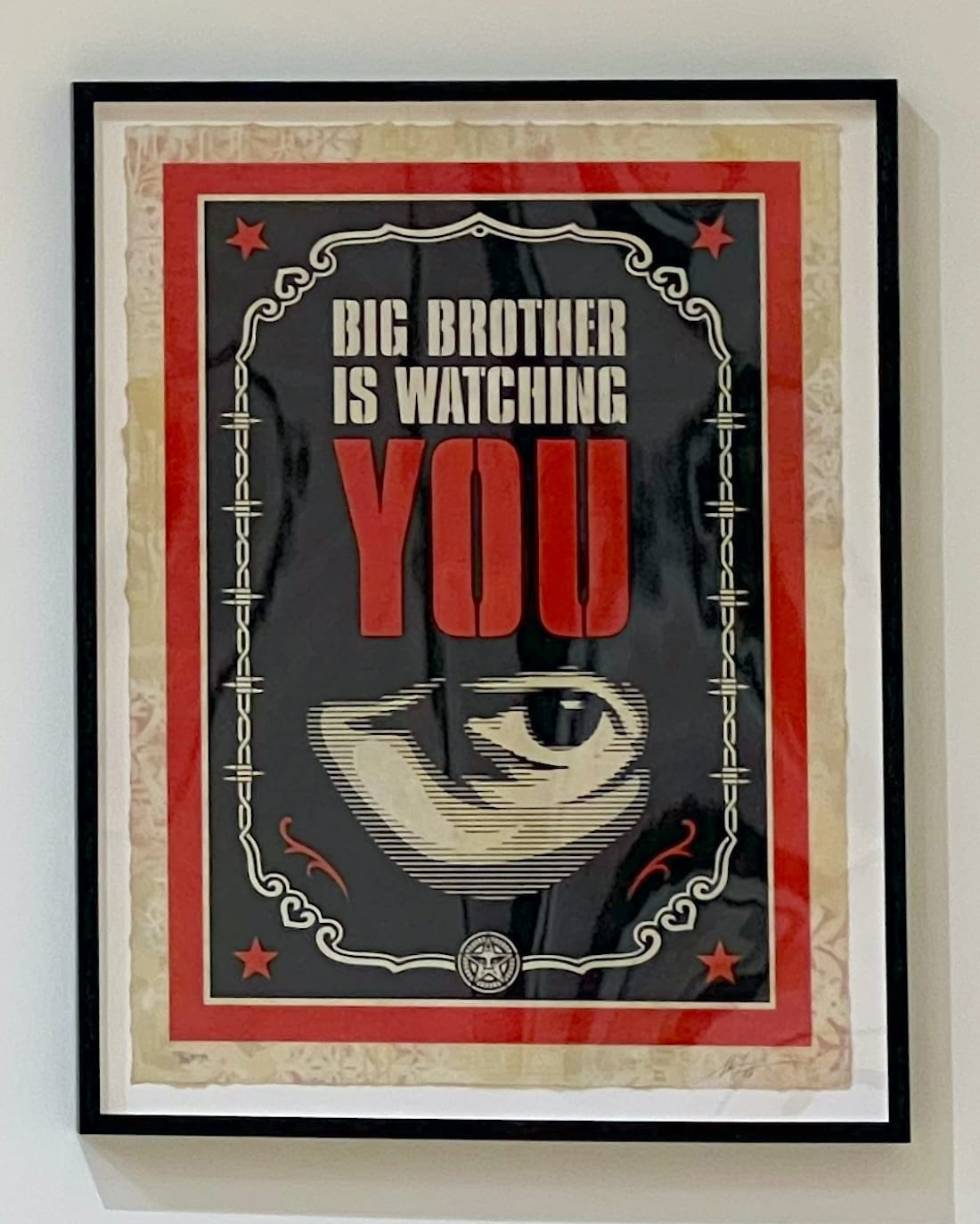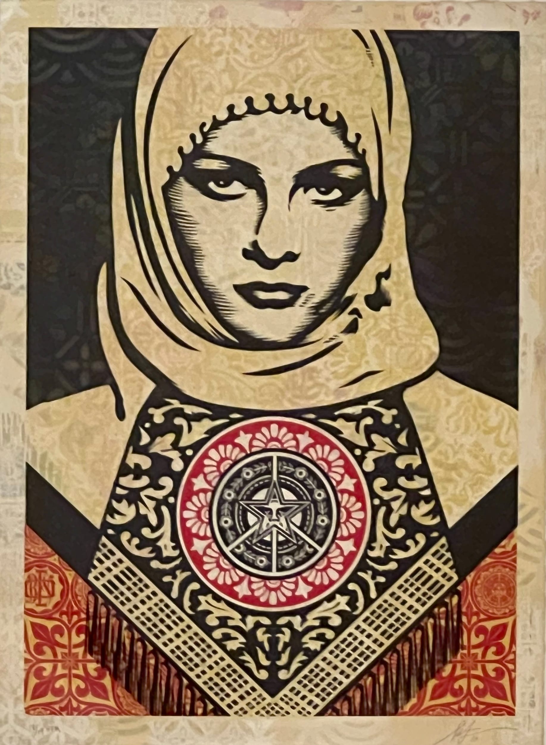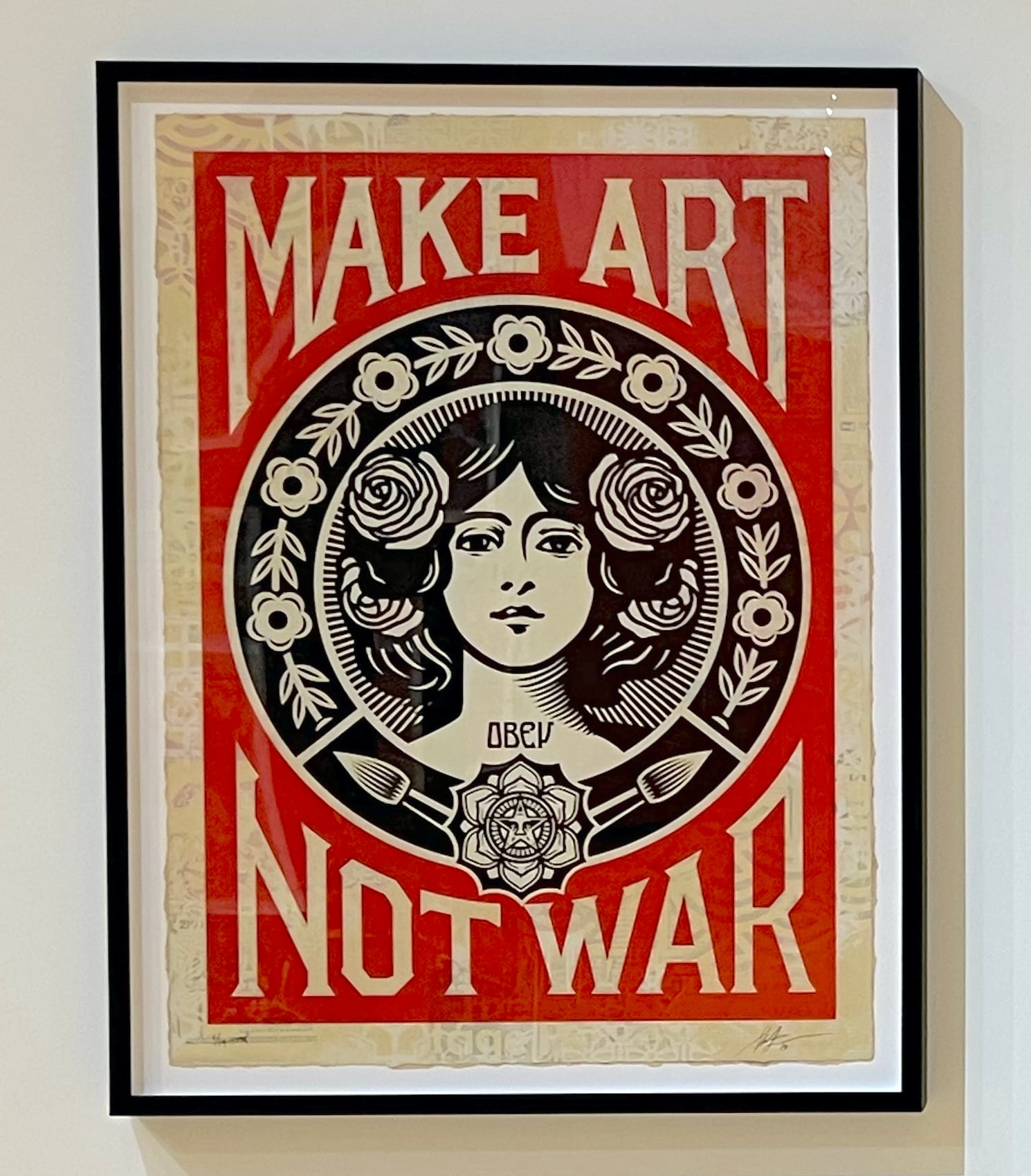 Museum texts state that the exhibition “reflects on the artist’s transformation from a 19-year-old skateboarding, punk-inspired undergraduate into the activist, humanitarian, father and husband he has become today.” But simply hanging dozens of Fairey’s silkscreen and mixed media collages on paper on gallery walls — albeit accompanied by detailed wall texts for individual works and a copy of his 2021 book that shares the exhibition’s title — does little to illuminate how the artist and his practice have evolved over time.
