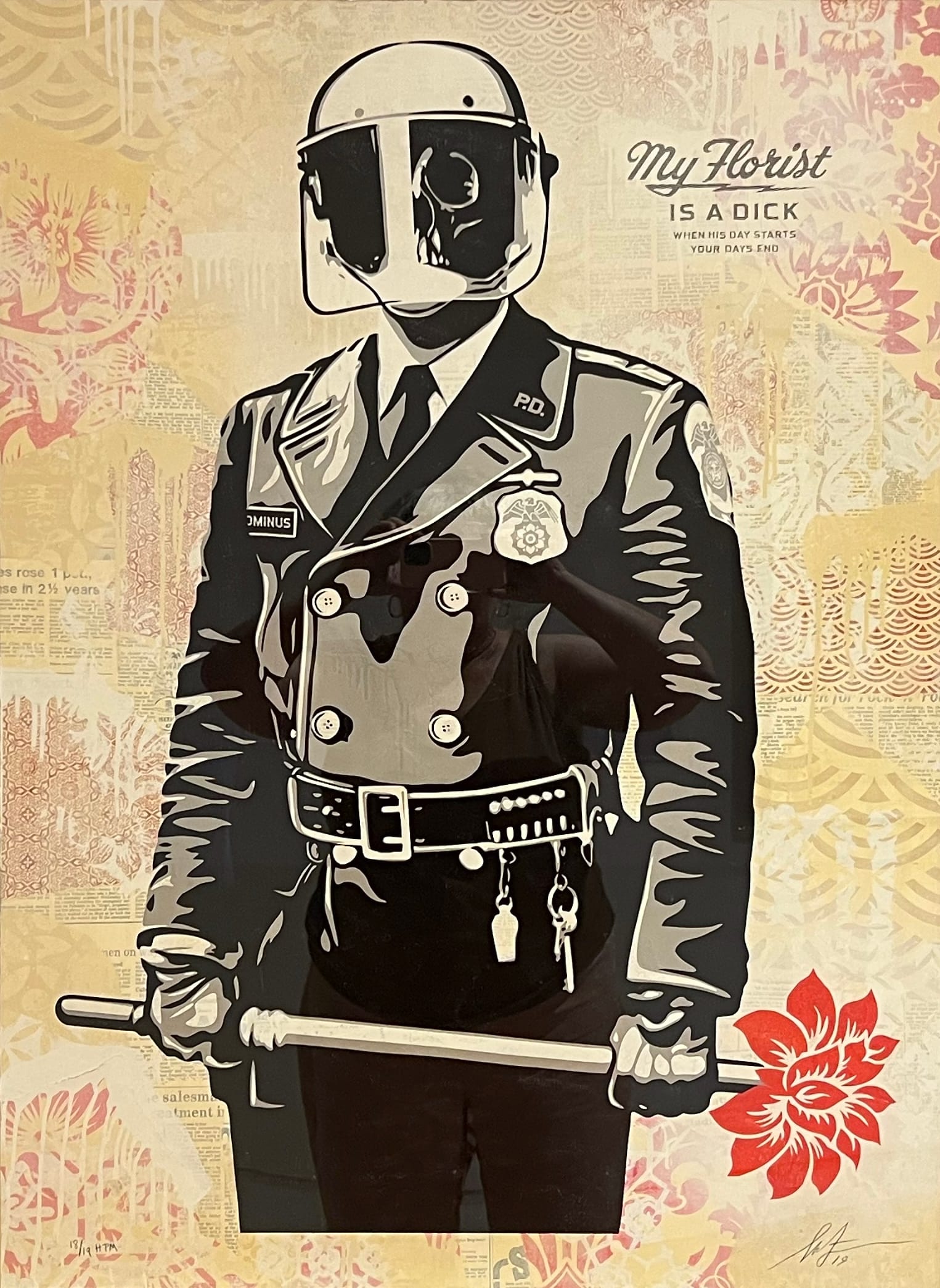 One piece informed by Fairey’s own experience with police brutality (“My Florist is a Dick,” 2019) was nearly pulled from the exhibition by city officials, leading to allegations of art censorship. The artwork features a police officer with a skeletal face dressed in riot gear, holding a baton that sprouts a red flower. Instead of being removed, it’s displayed in a corner of a gallery where it could be easily overlooked, a detail that underscores art’s role in challenging systems of power.