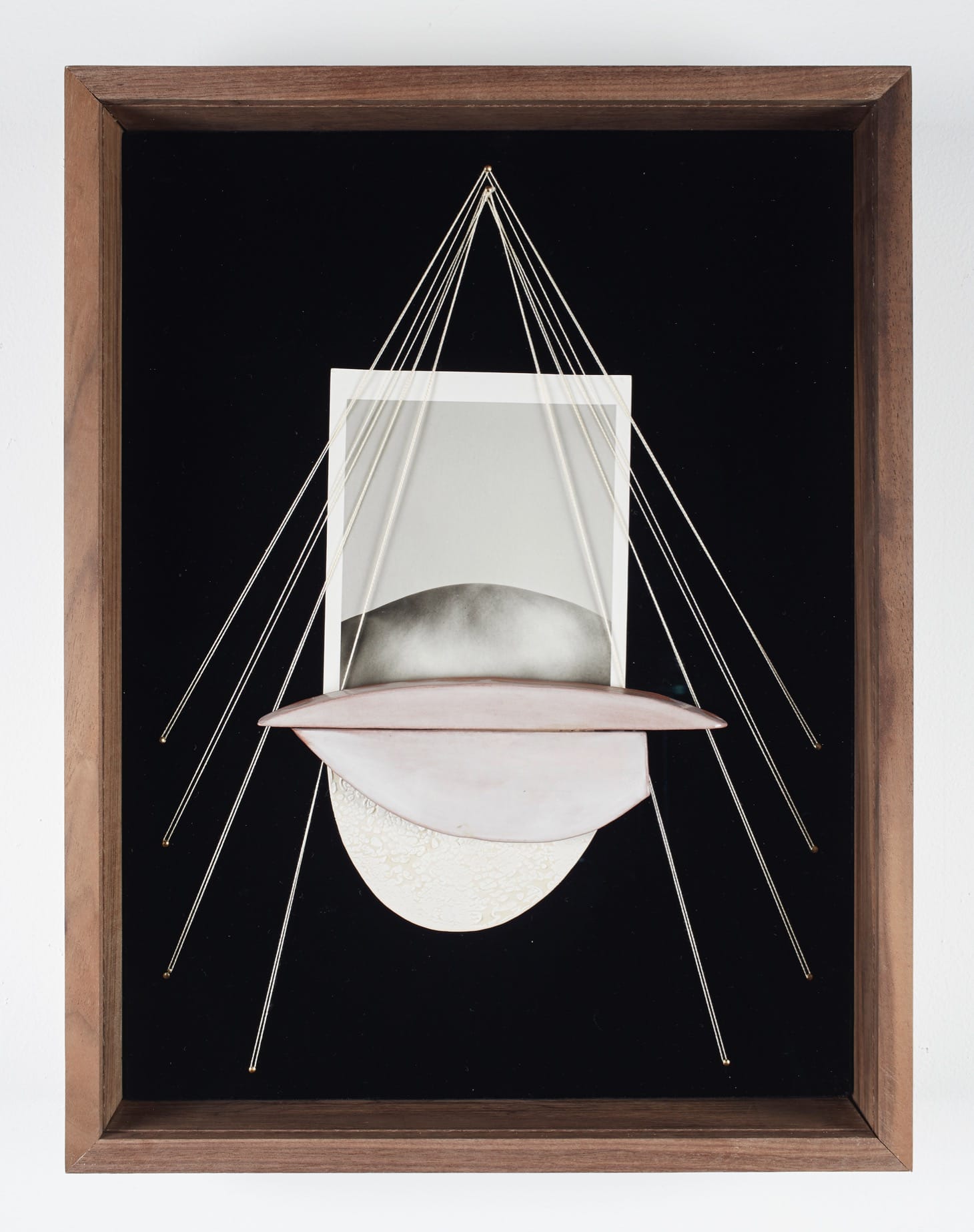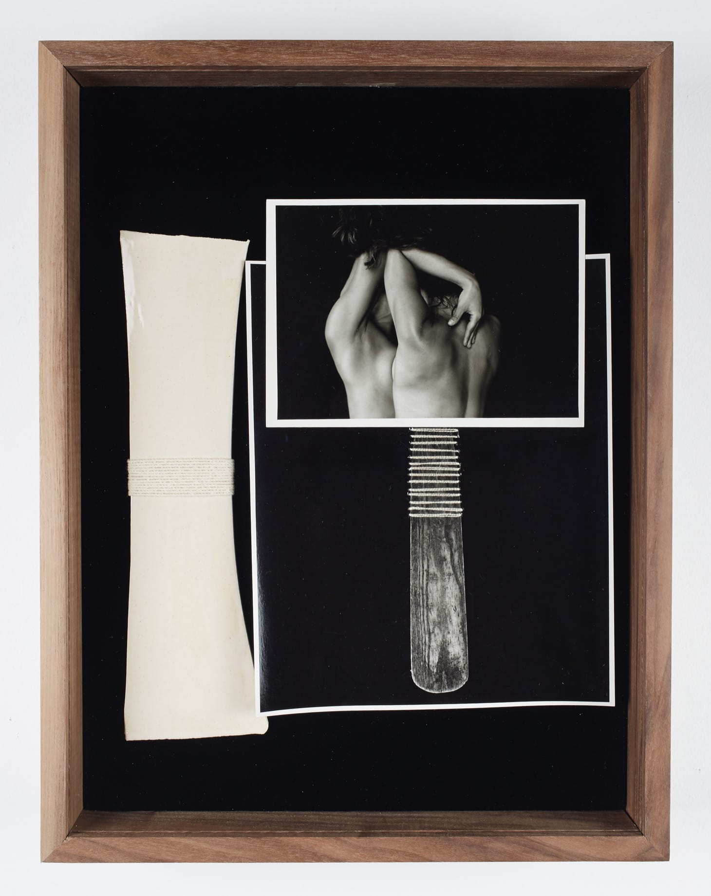 This photograph “Leaning In (3),” like all the works in Sheree Hovsepian’s exhibition at Higher Pictures gallery (all works 2019) depicts some section of the body in conversation with angular forms that ride a fine line between art object, design element, and utilitarian tool. The work all has the subtle feel of high Modernist composition, but demonstrates greater self-awareness of the politics that surround and inhabit our bodies. Here there are several skin tones, so what the viewer gets as representations of “the body” is really a range of bodies, so the work thankfully doesn’t reprise a version of whiteness (it isn’t clear whether there is a range of genders). The key feature of Hovsepian’s work is its focus on how (within a carefully composed picture plane) shapes inspired by bodies suggest relations, suggest purpose, hint at architecture. In “Empath,” for example, thin ropes made taut against carefully placed nails create a tent like canopy under which the image of the curve of a back like a distant hill seen in morning light plays off three other objects underneath the image. The scene is set up against the serenely dramatic surface of black velvet. It’s the compositional flair within the images that makes them seductive — despite having none of the objects sync up in a way that is visually symmetrical or fully resolved. Instead the flagrant playfulness is the point.