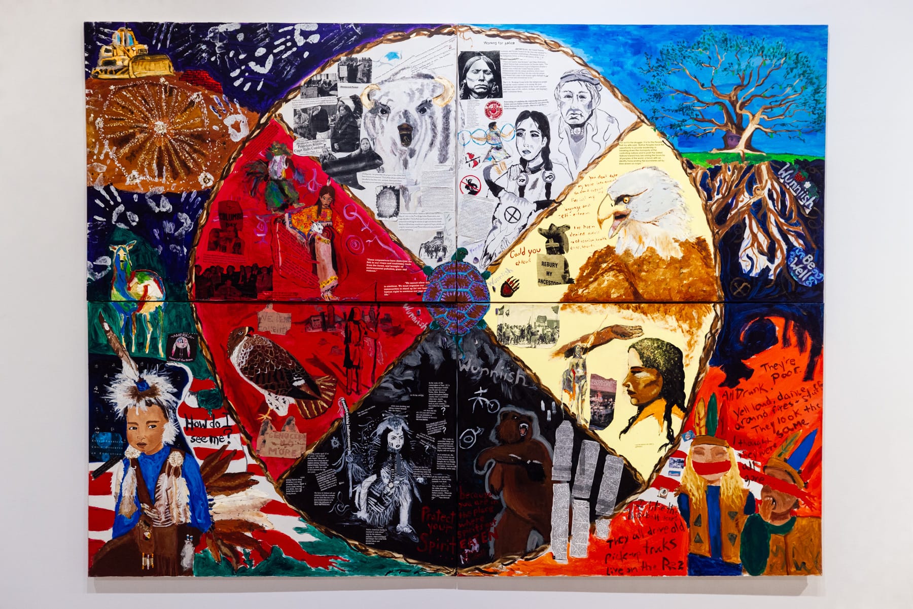 Present-day Shinnecock tribal members can claim their lineage to their ancestral landscapes for more than 10,000 years. Still, by 1884, Southampton residents had decided that Shinnecock people were destined to die off. European colonists perpetrated this vanishing race narrative to undermine the sovereignty of Shinnecock and other Tribal Nations to claim valuable lands that they hoped would soon free up. Shinnecock artist Denise Silva-Dennis wrote about her work, “Why tenacious? Because against all odds, the Shinnecock people have managed to hold onto 800 acres of ancestral territory since the 1640 English Immigrant invasion that started at Conscience Point. That’s 382 years.”