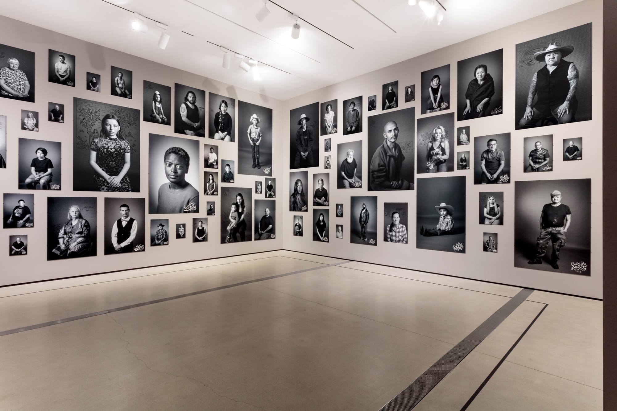 The show begins with a hanging of her Women of Allah series that includes some photographs she made in collaboration with famed photographer Bahman Jalali in 1996; these are the only artworks Neshat ever created in Iran. The exhibition ends with her most recent series, Land of Dreams, the first art she has created in the US. “Interestingly, while these two bodies of work are radically different in the way that one captures portraits of Iranians and the other Americans, I see many parallels between them,” Neshat remarks. “Aesthetically, they’re composed with a similar sense of minimalism, emotional intensity and intricate use of calligraphy. Secondly, I feel that these two series are my most personal work so far.” In her early work, the artist’s own body becomes the subject. In her most recent, the main character, Simin, becomes the embodiment of the artist. In both cases, Neshat explains, she’s reflecting her “own political questions and existential dilemmas.”
