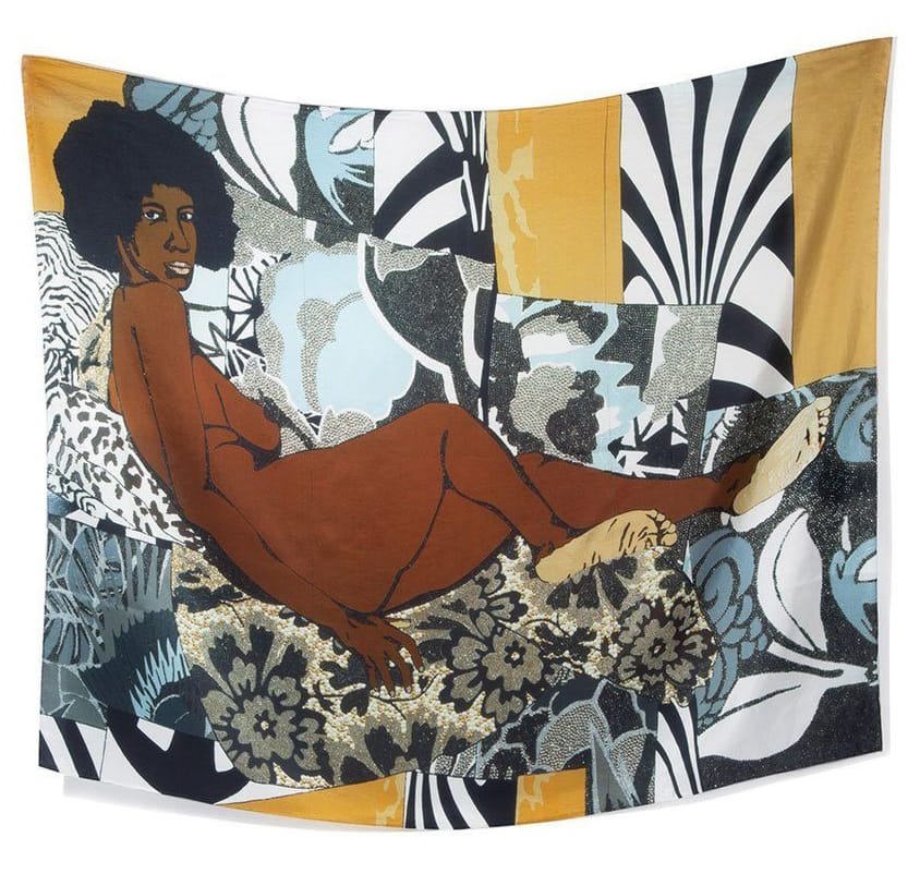 Fall is coming up fast and we can’t think of a more stylish accessory for those first brisk days than this delicate silk scarf, which is modeled off of “A Little Taste Outside of Love” by Mickalene Thomas. Her elaborate body of work, which we cover often at Hyperallergic, melds pop culture and art history as a means of addressing race, gender, sexuality, beauty, and power.