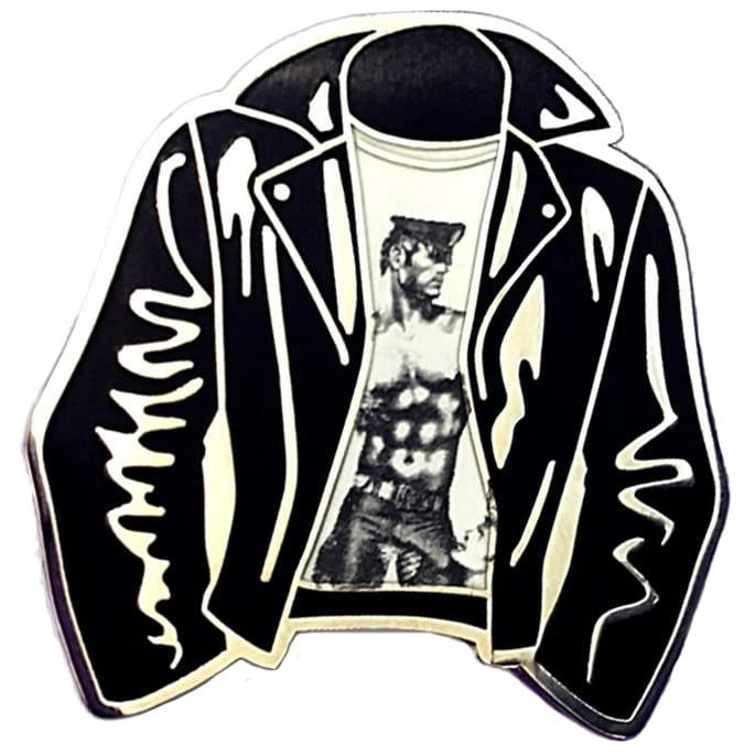 The t-shirt so saucily framed by the leather jacket on this pin features the gorgeous, muscle-bound work of Tom of Finland. His charged renderings of homoerotic encounters between archetypal hypermasculine characters helped define a gay subculture so beloved and prolific that it actually gave birth to an XXXmas edition of this very pin (we recommend getting your holiday shopping done early this year — check out the rest of our queer pin collection)!