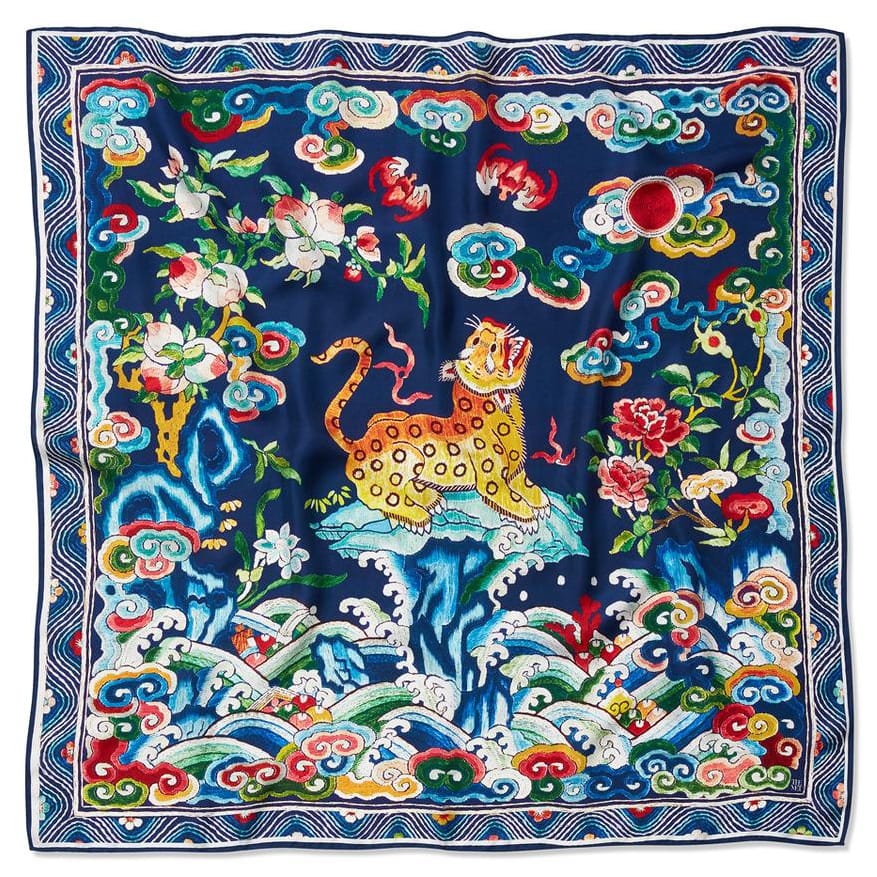 A luxurious new favorite of ours is this striking square scarf that features a pattern inspired by a late 18th/early 19th-century badge that once belonged to a Chinese government official. During the Qing dynasty, this fierce-looking leopard would have indicated the military rank of the wearer, but despite its tough appearance, this silk scarf is as soft as can be.