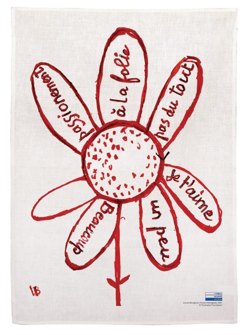 Is there anything more deceptively simple than a Louise Bourgeois? This whimsical linen tea towel features a delicate flower with writing on its petals, just waiting to be plucked. Roughly translated from French, the words mean: “I love you (a little, a lot, passionately, crazily, not at all),” harkening to the classic “loves me, loves me not” game of prediction. (Shop the rest of our Louise Bourgeois collection!)