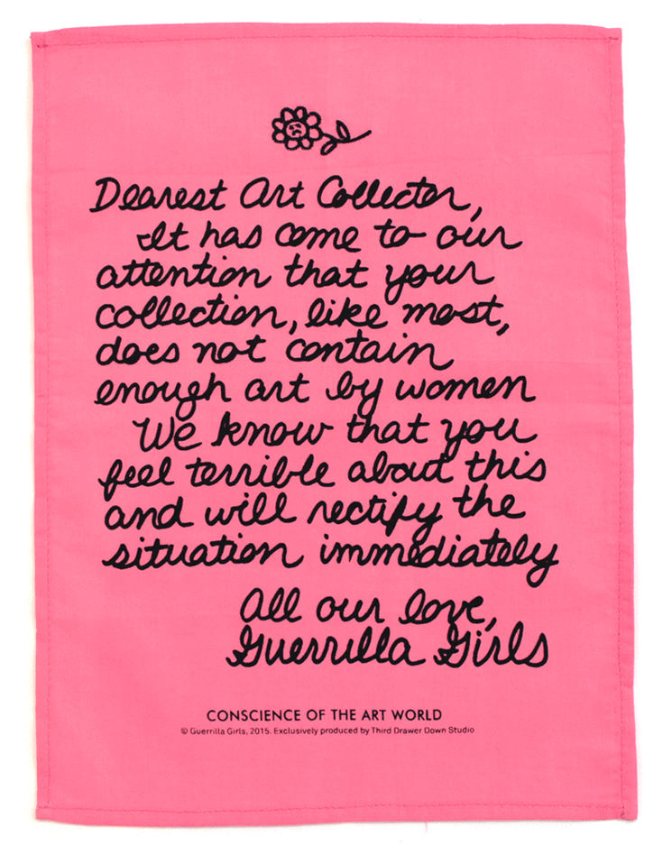 This handkerchief by the Guerrilla Girls, the collective of anonymous feminist activist artists devoted to fighting racism and sexism within the art world, makes for a polite but firm reminder that most art collections are embarrassingly lacking in their representation of work by women. However, they graciously offer potential collectors a second chance with their charming and affordable merch. (Shop our whole Guerrilla Girls collection!)