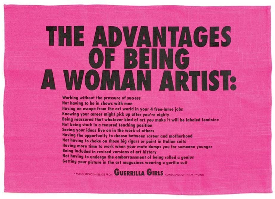Originally a poster that appeared in New York City in 1988, this tea towel is infused with Guerrilla Girls pink and lists 13 advantages of being a woman artist, such as being included in revised versions of art history and not having to undergo the embarrassment of being called a genius! This sardonic design also comes as a clutch.