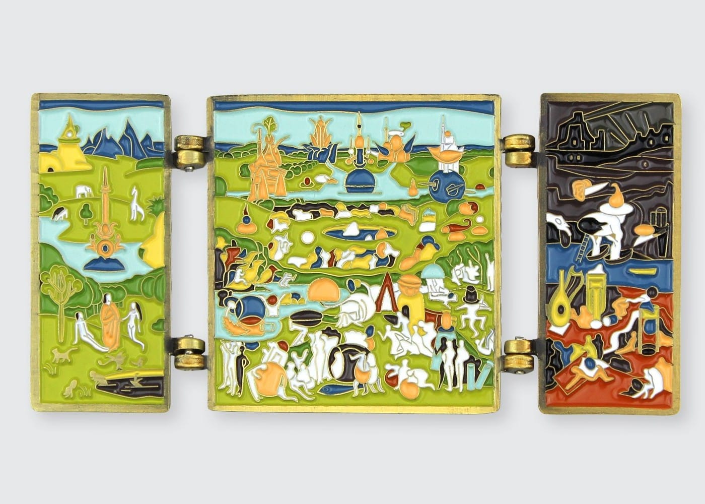 This decadent pin is modeled off of Northern Renaissance painter (and rumored ergot-eater) Hieronymus BoschHieronymus Bosch’s masterpieceThe Garden of Earthly Delights. Just like the painting that inspired it, this pin is also a functional triptych, with hinges on either side that you can open and close or even use to stand up on its own. Truly, a delight.